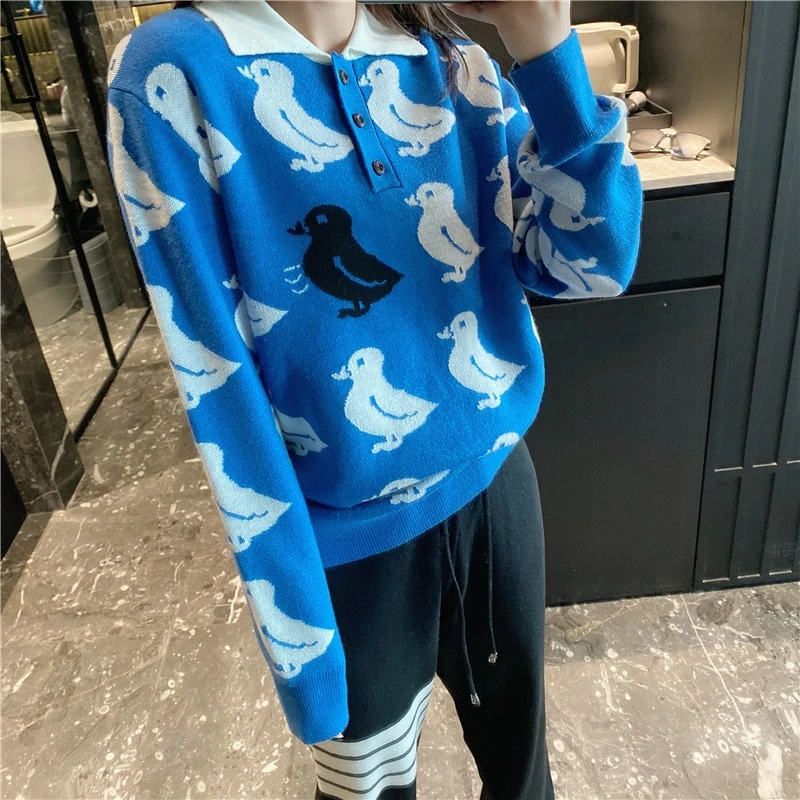 Отзывы о Весенне-осенний милый свитер с лацканами изображением синей утки повседневный