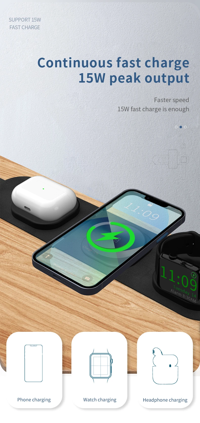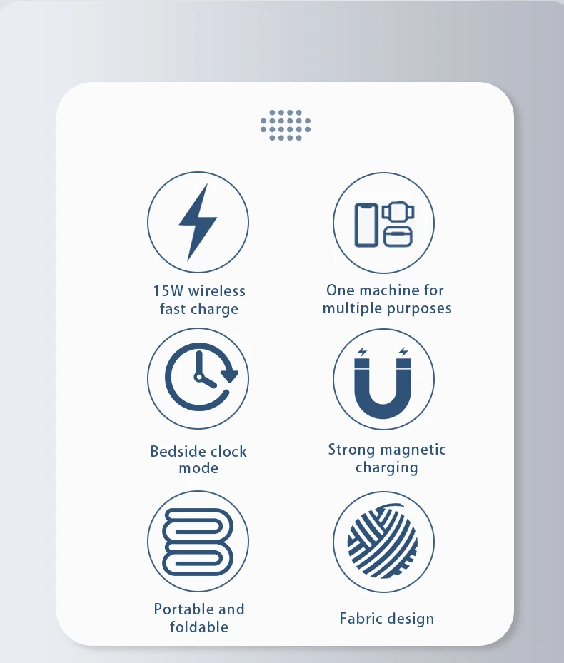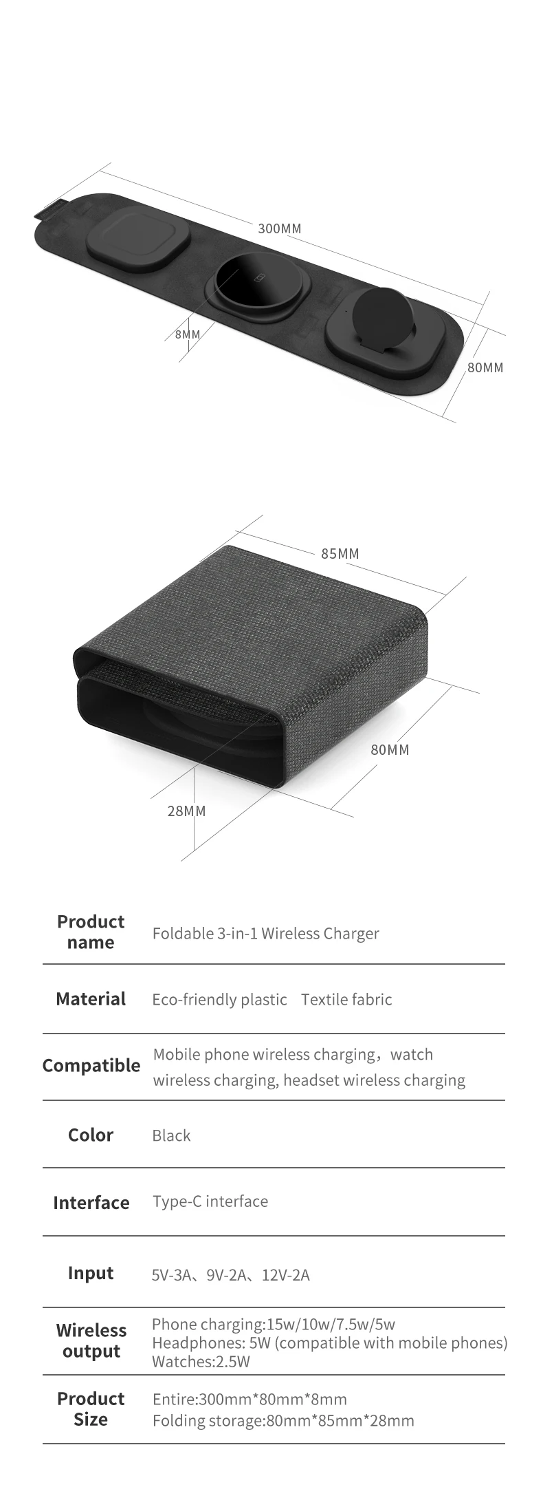 Название продукта: складное Беспроводное зарядное устройство «Три в одном» Материал: Экологически чистая пластиковая текстильная ткань Совместимость: Беспроводная зарядка для мобильных телефонов, Беспроводная зарядка для часов, Беспроводная зарядка для наушников Цвет: черный Интерфейс: интерфейс Type-C Вход: 5V-3A, 9V-2A, 12V-2A Беспроводной ток на выходе: мобильный телефон зарядное устройство: 15 Вт/10 Вт/7,5 Вт/5 Вт Наушники: 5 Вт (совместим с мобильными телефонами) Часы: 2,5 W