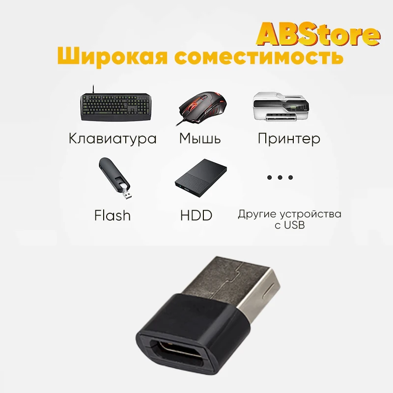 Адаптер с Type-C на USB A. При помощи данного адаптера вы можете подключить к своему устройству с USB выходом, например, ноутбук. Важно уточнить заранее совместимость устройств. Примерный перечень совместимых устройств и типов файлов в прилагаемой документации.