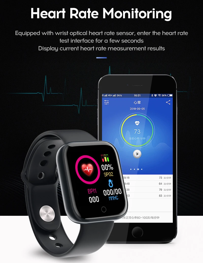 Y68Категории наручных часов: для детей и взрослыхСтиль наручных часов: МодныйФункция наручных часов1. Поддержка Bluetooth 4,0, Android , IOS2. Коснитесь экрана, чтобы контролировать наручные часы3. Шаги, калории, расстояние: при упражнениях он может записывать количество шагов, сожженные калории, траекторию бега и расстояние до Место назначения.4. Монитор сердечного ритма: он будет точно контролировать и записывать ваш пульс.5. Монитор артериального давления: он будет точно контролировать и записывать ваше кровяное давление.6. Монитор сна: во время сна, он может контролировать время и качество сна.7. Напоминание о сидячем положении: Установите время напоминания о сидячем положении, оно будет вибрировать, чтобы напомнить вам об отдыхе.8. Будильник9. Дистанционное управление фотографией: в пределах 10 метров, вы можете встряхнуть его, чтобы управлять телефоном, чтобы делать фотографии.10. Напоминание о сообщениях и звонках: когда телефон получает звонок или сообщение, он будет вибрировать, чтобы напомнить вам.11. 10 дней в режиме ожидания.Наручные часы с циферблатомТип часового механизма: СмартБатарея для наручных часов: 170-200 мАчНаручные часы Форма циферблата: прямоугольникТип дисплея наручных часов: светодиодныйЧехол для наручных часов Материал: сплав/смолаНаручные часы Материал циферблата: стеклоНаручные часы цвет циферблата: черныйРемешок для часовМатериал ремешка: силиконТип застежки ремешка: ПряжкаЦвет ремешка: черный/белый/розовый/серебристый/оранжевый/серыйРазмер и весДлина наручных часов: около 25 смНаручные часы Диаметр циферблата: около 4 смТолщина циферблата часов: около 1 смШирина ремешка: около 2 смВес наручных часов: приблизительно 30 гПосылкаНаручные часы X 1Примечание: Уважаемые покупатели, для этих часов не требуется зарядный кабель, его можно заряжать непосредственно через зарядную головку или usb-интерфейс (зарядная головка в комплект не входит)Часы нельзя носить для плавания или купания. Только экран водонепроницаемыйВодонепроницаемая СпецификацияВы можете мыть руки и лицо при носке.Но это не поддерживает купание, плавание, дайвинг.Примечания:1. Когда вы получите его, пожалуйста, убедитесь, что зарядили его в течение 20 минут перед использованием. В противном случае он может не включаться из-за низкой мощности.2. Носимые устройства отслеживают деятельность человека с помощью электронных датчиков, и они находятся на потребительском электрическом уровне. Это нормально для определенного отклонения. Пользователь должен рассматривать данные объективно.3. Пожалуйста, не сравнивайте с больничным оборудованием для чтения, это не медицинское устройство! Пожалуйста, не покупайте для проверки здоровья (проблемы с сердцем, проблемы с кровяным давлением) Это не для профессионального использования. Просто может быть ссылка.