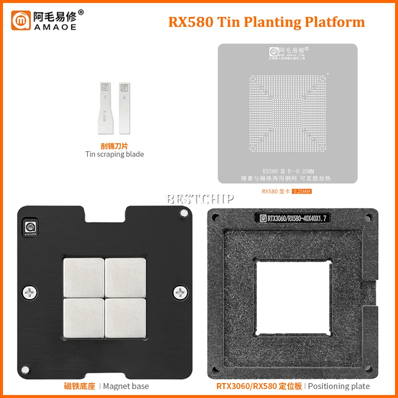 DescriptionAmaoe BGA Reballing Stencil RX580 Video card GPU BGA Stencil VGA Driver Reball Solder Tin Plant Net Mesh Welding Heat Template Steel Mesh Rework 0.25mm