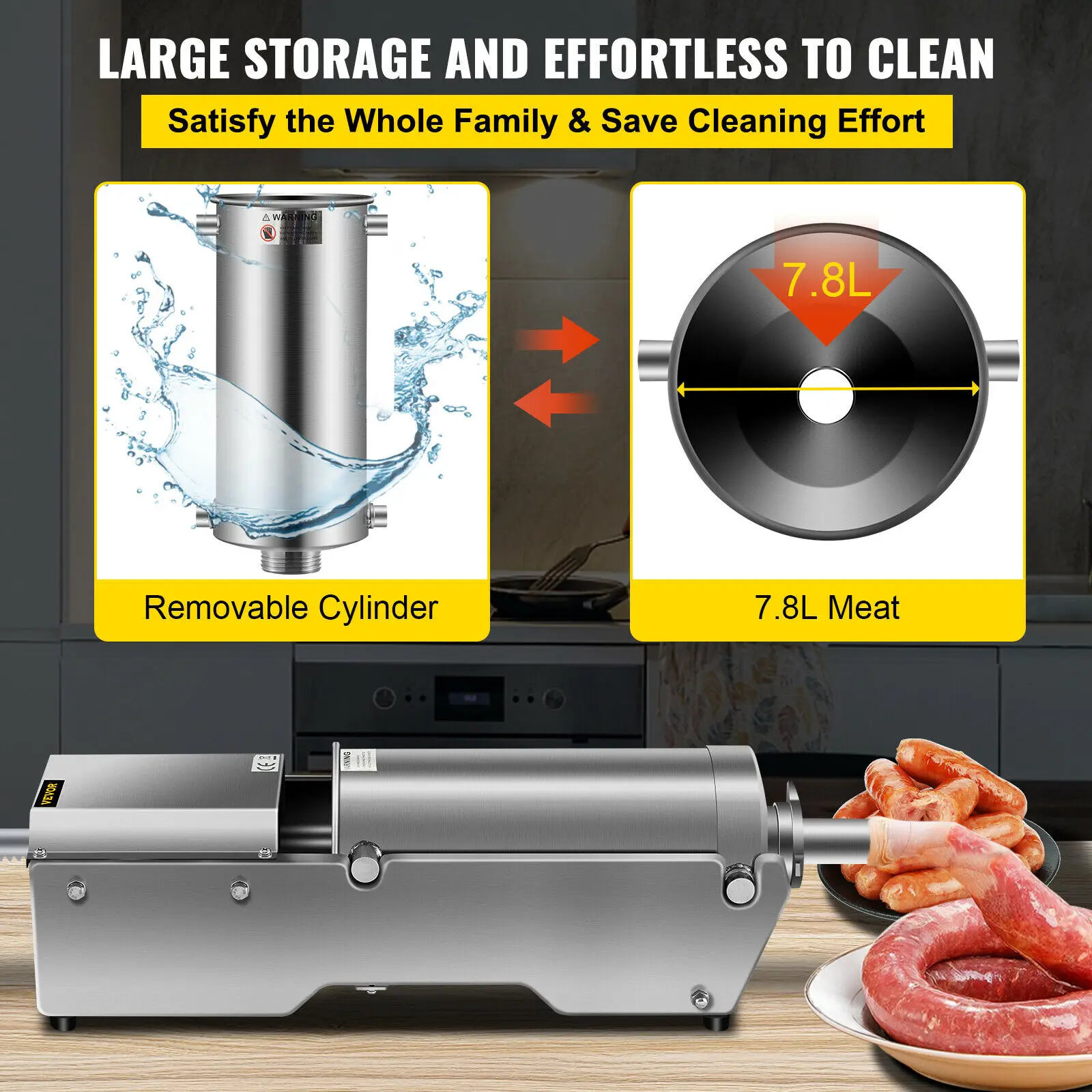 Большая емкость и простота очистки: Эта горизонтальная колбасная машина оснащена цилиндром из нержавеющей стали с емкостью 3 литра/7 фунтов, который может держать большое количество мяса и экономить ваше рабочее время. Съемный дизайн удобен для чистки.