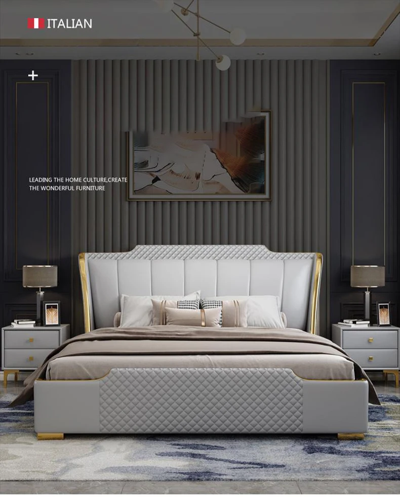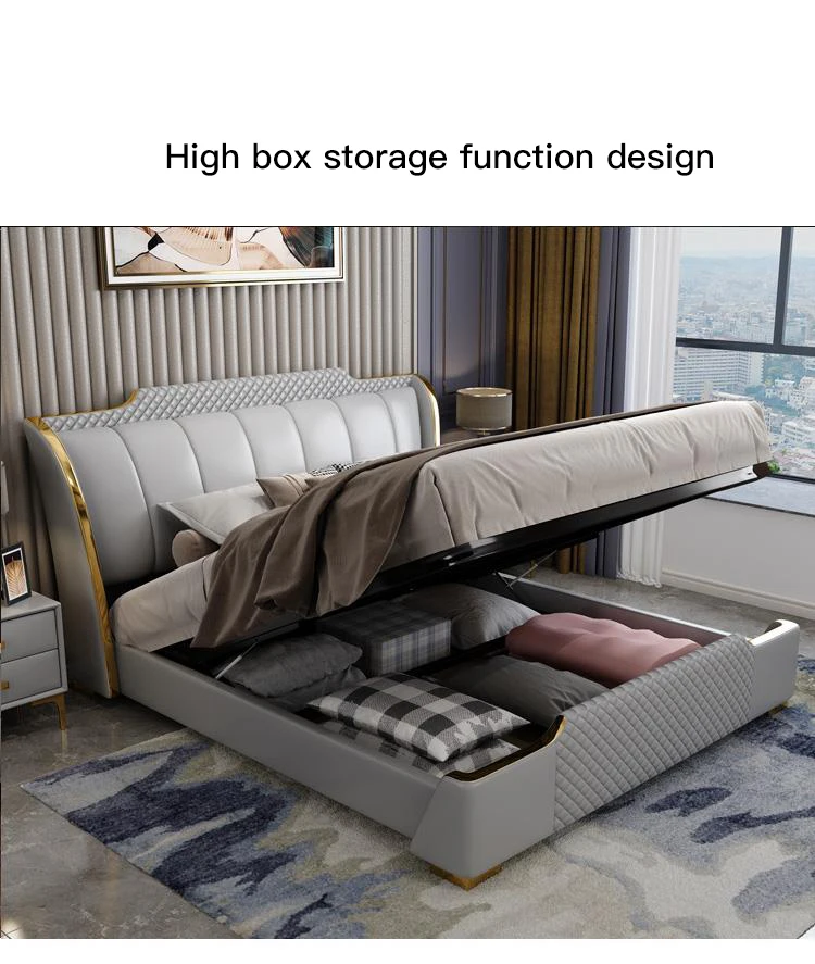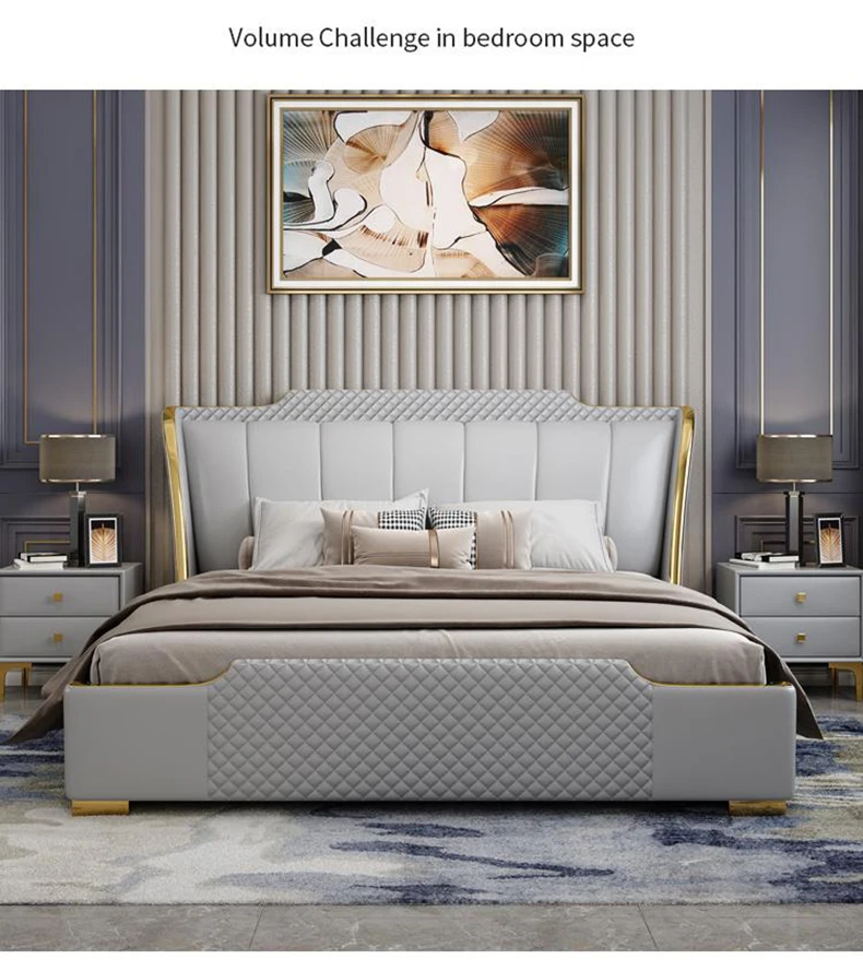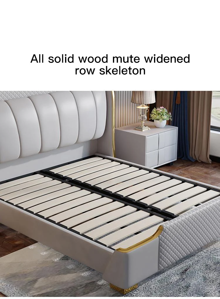 Luxury White Diamond Texture Leather Bed Big Sponge Backrest Metal King Frame High Box Storage Compact Room Master Bedroom