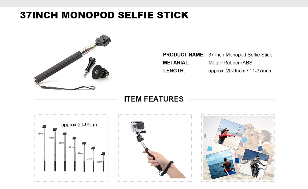 【Selfie stick】 Легкая ручка; Достаточно стабильная, чтобы поддерживать ваши экшн-камеры; Возможность захвата для удлинения удобно и легко снимать автопортреты и видео.