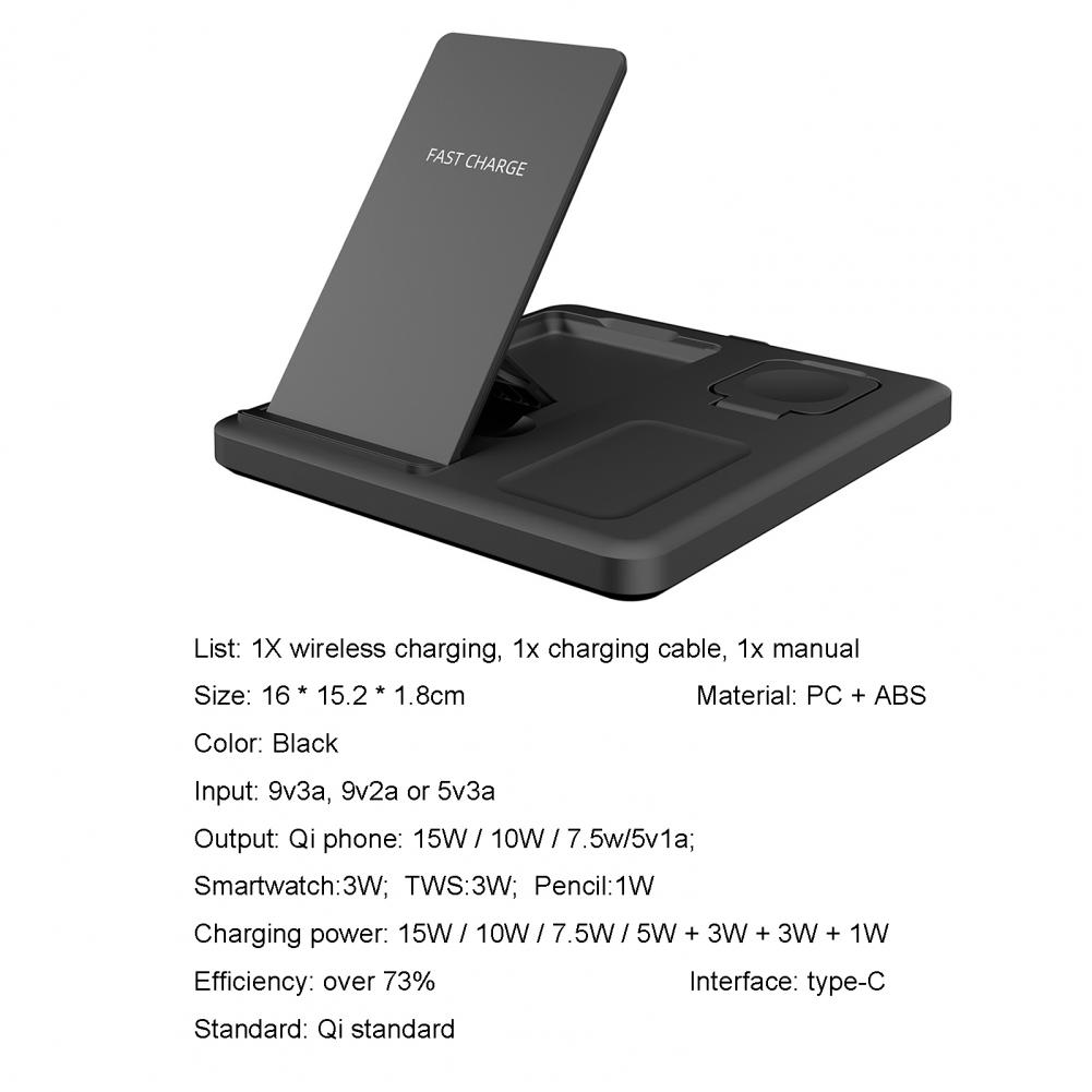 Выход: зарядное устройство Qi для телефона: 15 Вт/10 Вт/7,5 W/5V1A; Smartwatch:3 Вт; Карандаша: 1 Вт
