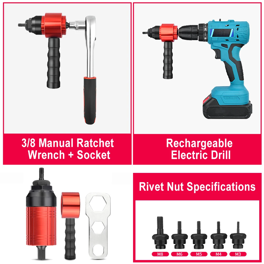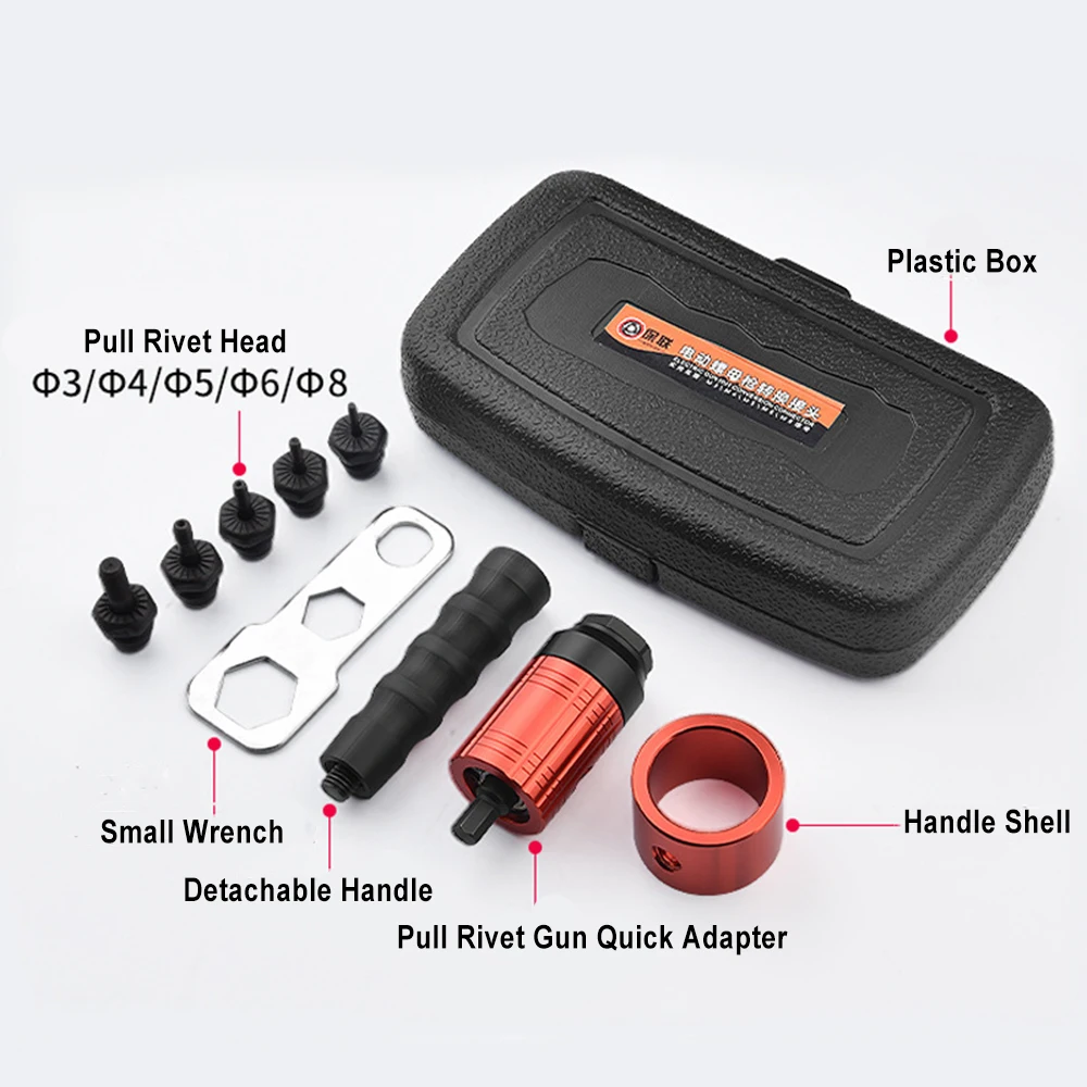 Практичный набор инструментов для преобразования: с этим набором инструментов, вы можете преобразовать ваш 3/8 Трещоточный ключ или электрическую дрель в ручную или электрическую заклепочную машину, и вам больше не нужно приобретать отдельный Клепальный Инструмент.