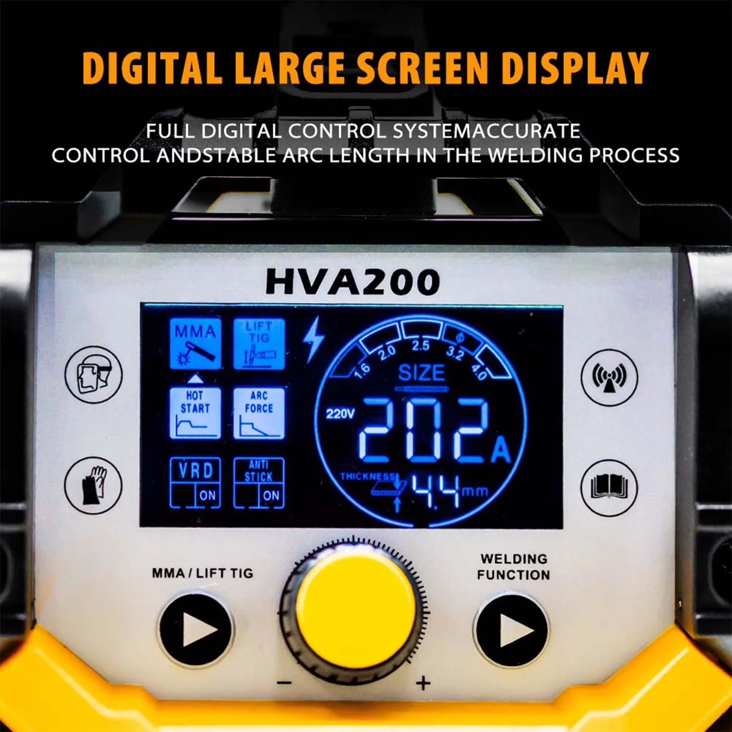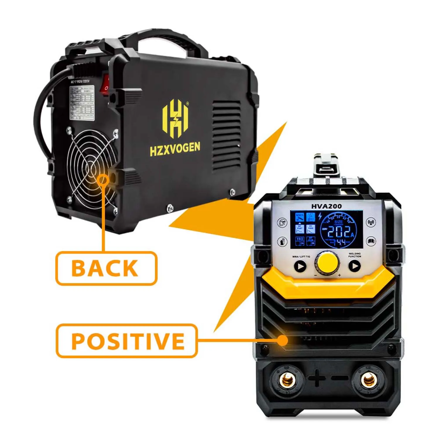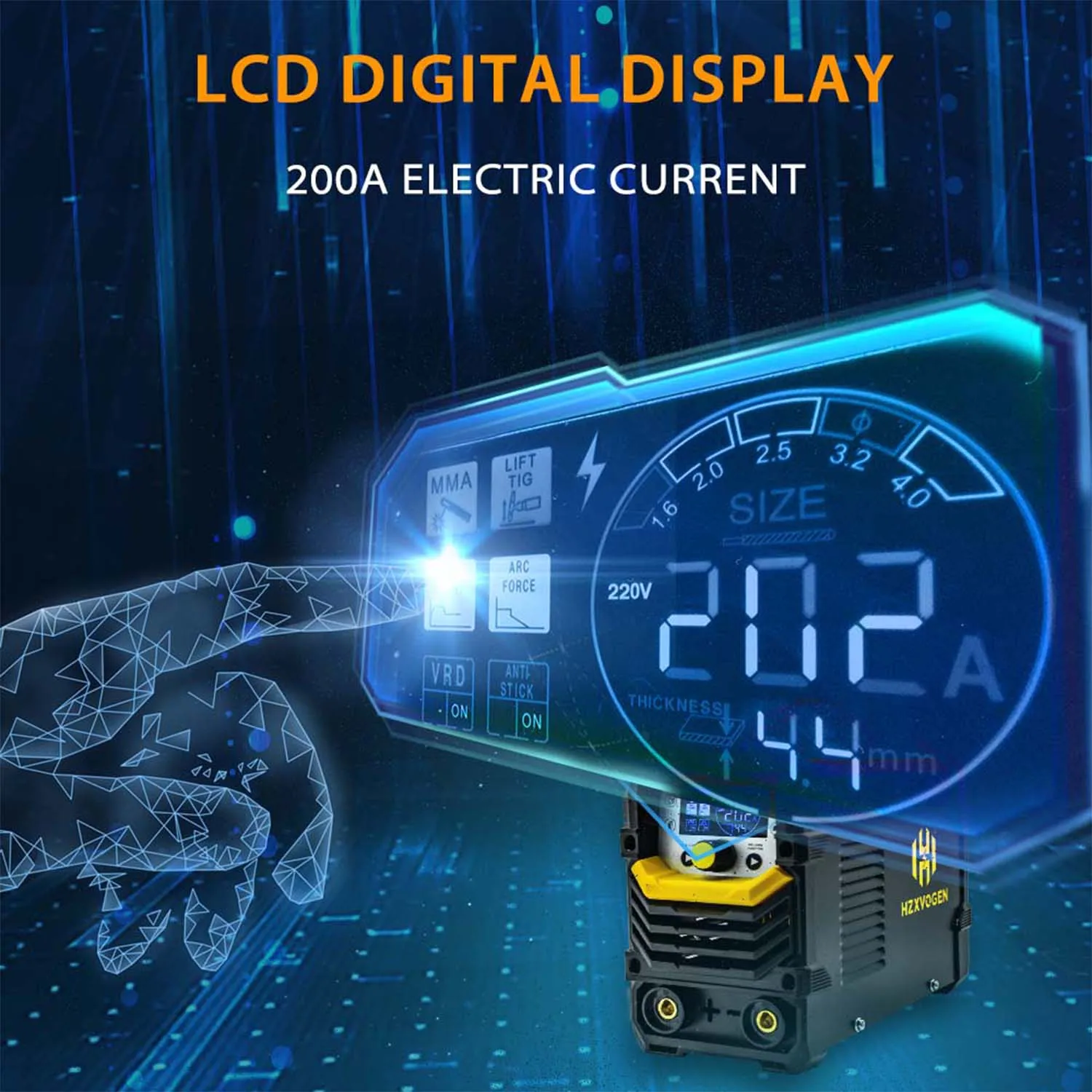 【 Цифровой ЖК-дисплей 】: сварочный аппарат HZXVOGEN HVA200 MMA оснащен цифровым ЖК-дисплеем, а большой цветной ЖК-дисплей четко руководит каждым этапом процесса сварки, что делает сварку легкой и эффективной.