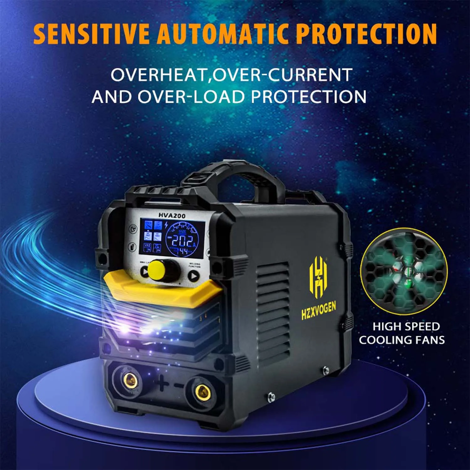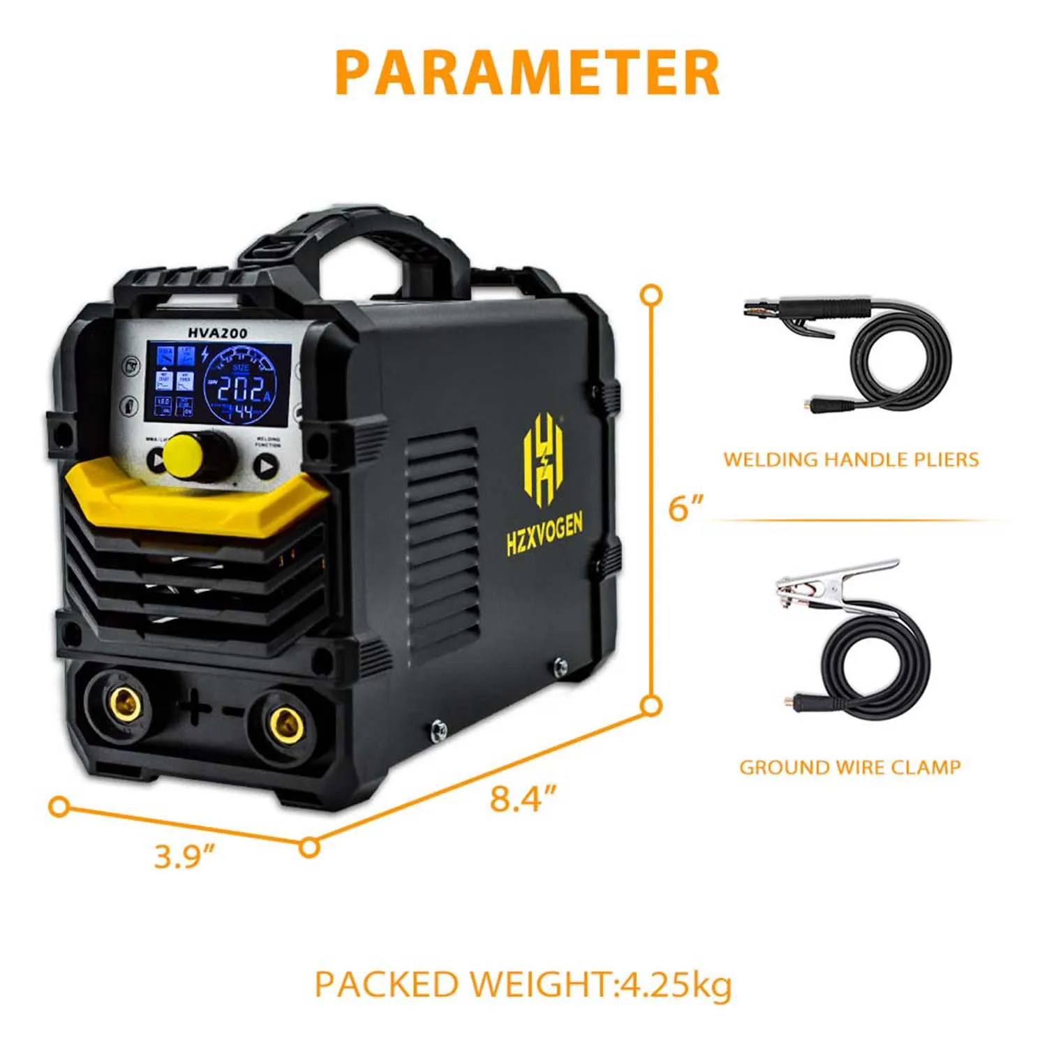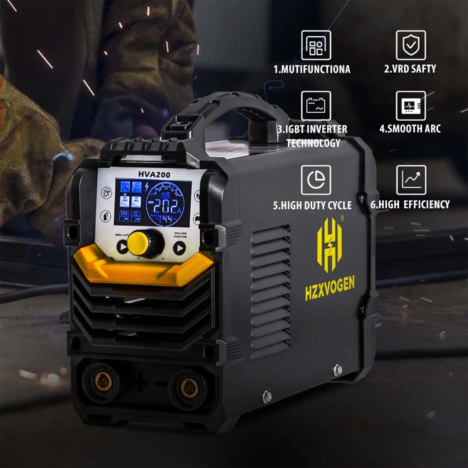 【 Цифровой ЖК-дисплей 】: сварочный аппарат HZXVOGEN HVA200 MMA оснащен цифровым ЖК-дисплеем, а большой цветной ЖК-дисплей четко руководит каждым этапом процесса сварки, что делает сварку легкой и эффективной.