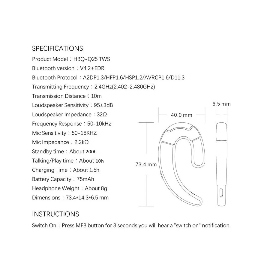 Особенности:1. Известный бренд CSR bluetooth ic chip, HD качество звука, чистый микрофон. Новейшие технологии Bluetooth костной проводимости, стабильная и быстрая скорость.2. Предназначен для эргономики, износостойкости, без падений и боли. Не входит в дизайн уха. В ношении Нет боли в течение длительного времени.5. Микрофон высокой четкости поддерживает звонки, свободные руки и легкий вес. Стереозвук сабвуфера, Наслаждайтесь музыкой, как на шоу в реальном времени. Спецификация:Версия Bluetooth: V4.2 + EDRTrabsmitting частота: 2,4 ГГц (2,402-2,480 ГГц)Протокол Bluetooth: A2DP/HFP/HSP/AVRCPРасстояние передачи: 12 мЕмкость аккумулятора: 75 мАчВремя воспроизведения музыки: 5-6 часовВремя разговора: 10 часовВремя работы в режиме ожидания: 160 часовВремя зарядки: 1-2 часаНапряжение зарядного устройства: 5 В постоянного тока Один наушник включает в себя:1x bluetooth-наушники1x USB кабель1x Руководство пользователя Два наушника включают в себя:2x bluetooth-наушники1x Usb кабель1x Руководство пользователя