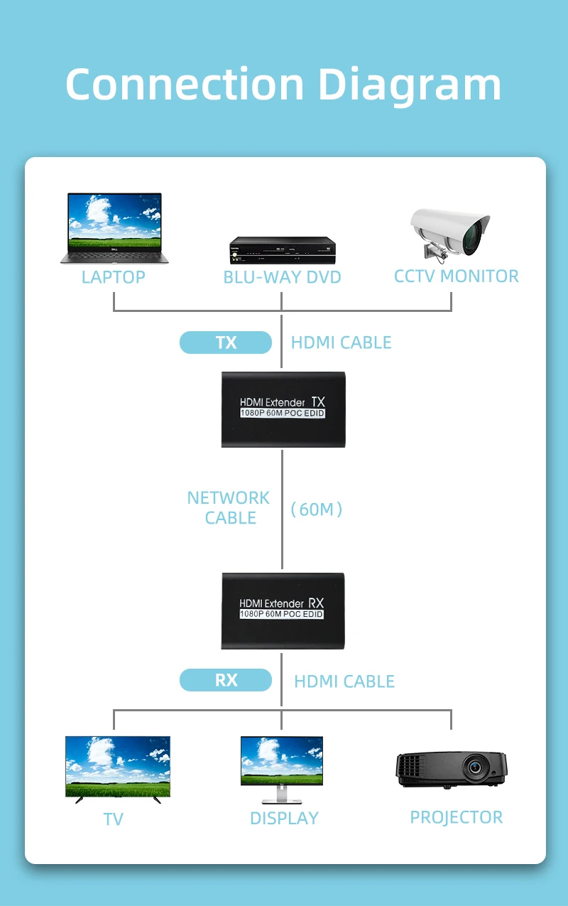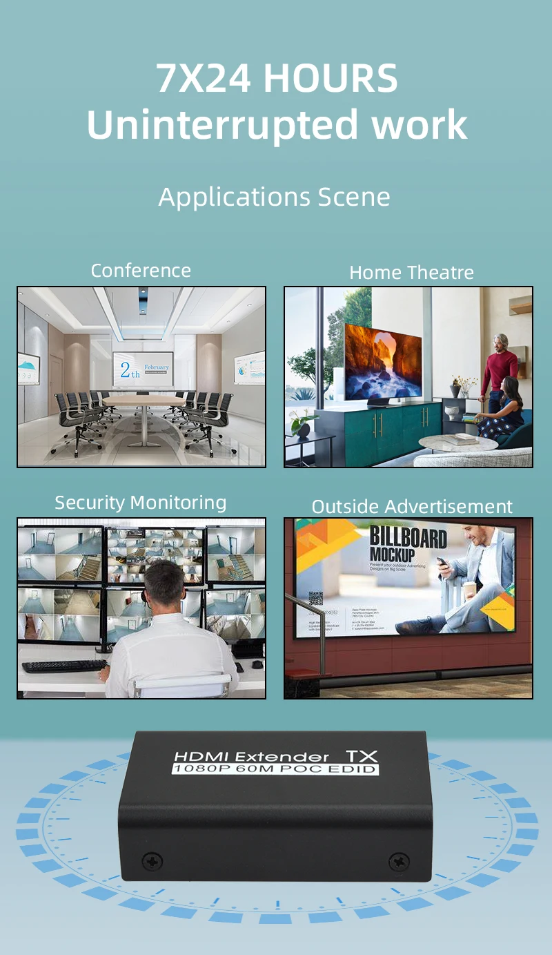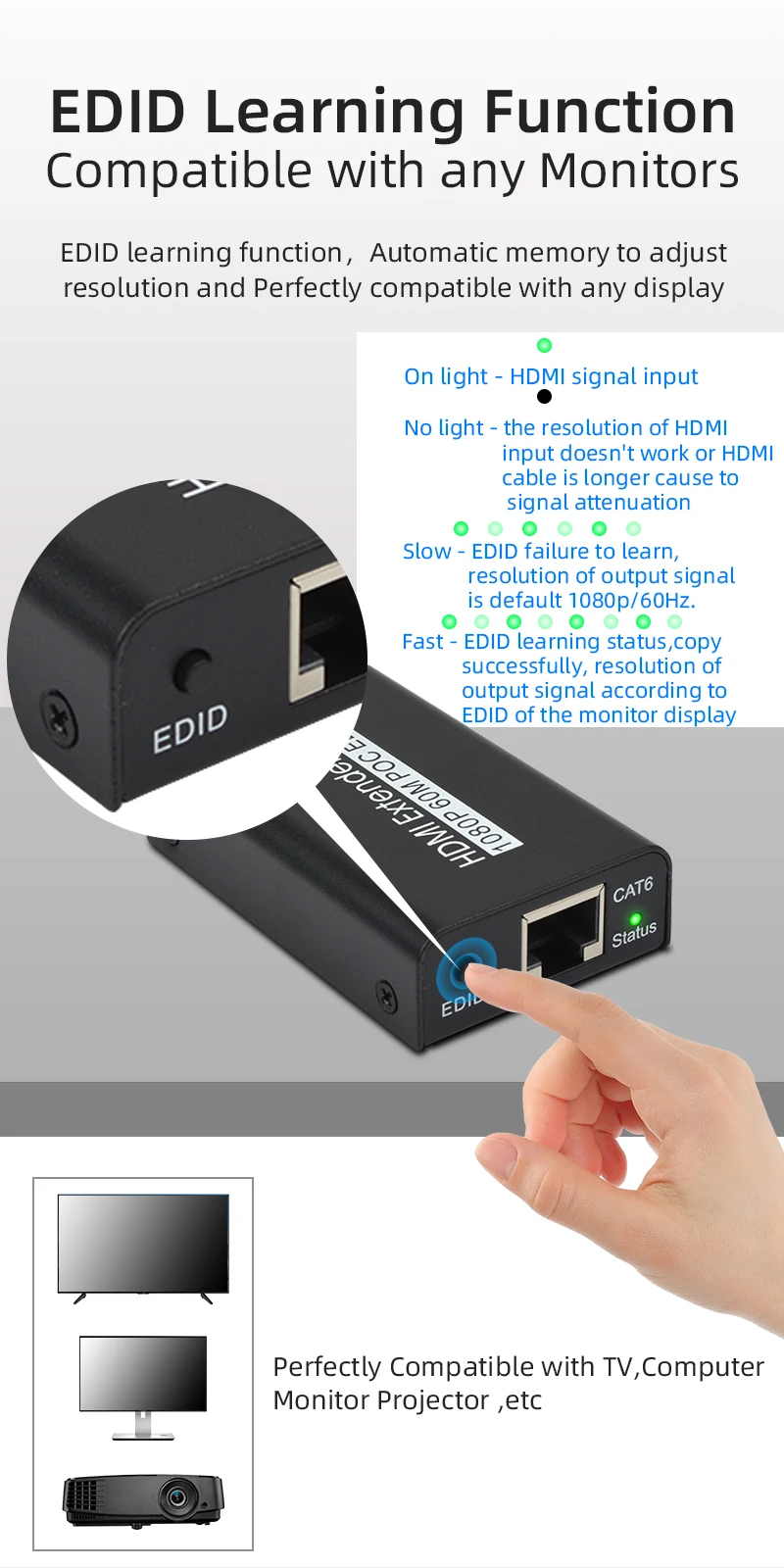 Трудно передавать сигнал высокой четкости на большое расстояние, и кабель HDMI является дорогим и редким, поэтому этот удлинитель HDMI решает эти проблемы. Просто используйте один сетевой кабель cat6/cat6a/cat7 вместо кабеля HDMI для расширения сигнала HDMI до 60 м, что экономит ваши деньги и пространство, он также поддерживает обучение EDID и идеально совместим с любым дисплеем.