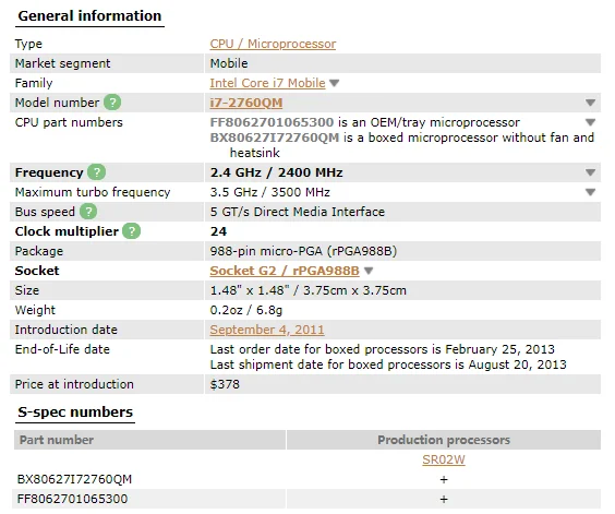 Отзывы о Интел Коре I7-2760КМ SR02W Процессор i7 2760КМ для ноутбука CPU Socket G2 rPGA988B Подходит на чипсетах HM65 75 76 77
