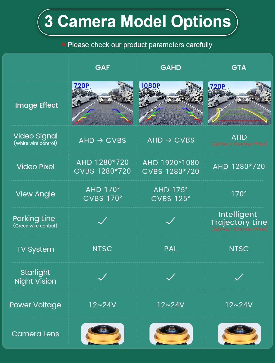* Примечание: AHD траекторная камера не нуждается в интерфейсах CANBUS или OBD, камера имеет встроенный модуль отслеживания заднего хода. Он автоматически регулирует руководство в соответствии с движущимся положением и скоростью кузова и направлением автомобиля вместо управления рулевым колесом. Работает только с мониторами, поддерживающими видеосигнал AHD 720P.
