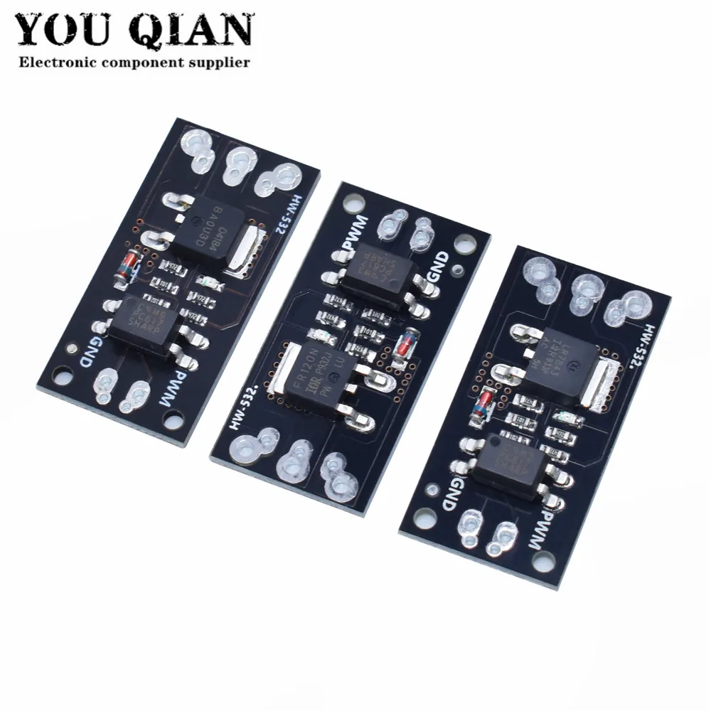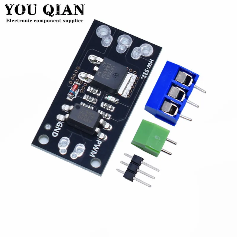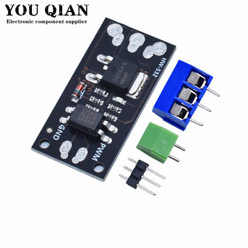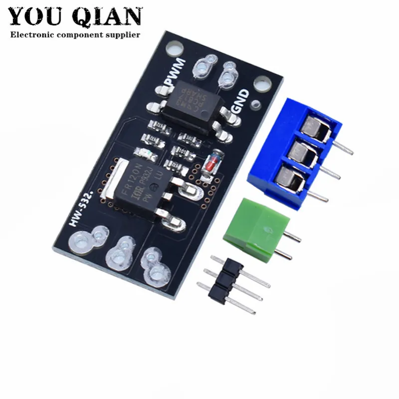 Характеристики модуля: 1. С Изоляцией оптопары, управляющий сигнал и мощность управляемого устройства изолированы, что значительно увеличивает жесткость помех. 2. Совместимость с микроконтроллером (MCU) и панели управления Arduino, 3V или 5V сигнала 3. Высокий уровень старт, низкий уровень стоп, PWM регулирование скорости 4. Широко используется для управления запуском и остановкой двигателя, электромагнитного клапана и другого оборудования 5. Есть различные спецификации MOS tube, чтобы обеспечить выбор, E.g: FR120N : 100V 9.4A LR7843 : 30V 161A AOD4184: 40V 50A 6. Сигнальная Входная сторона может быть приварена к терминалу или самому штифту, Совместимый макет 7. Выход может быть припаян к клемме или прямой проволоке 8. Размер модуля 23 мм X 16 мм есть два отверстия 2 шуруп диаметром мм, расстояние между отверстиями 8 мм