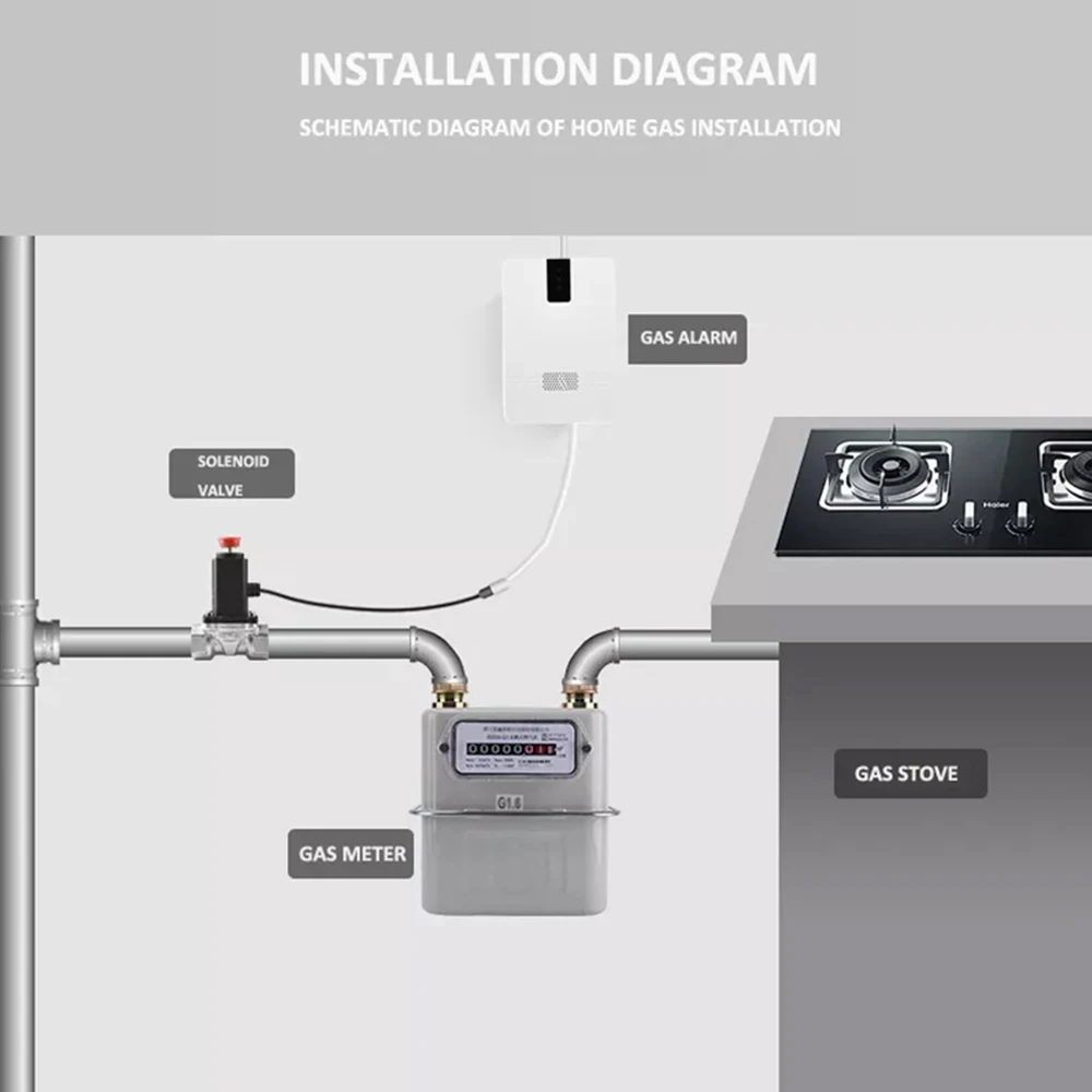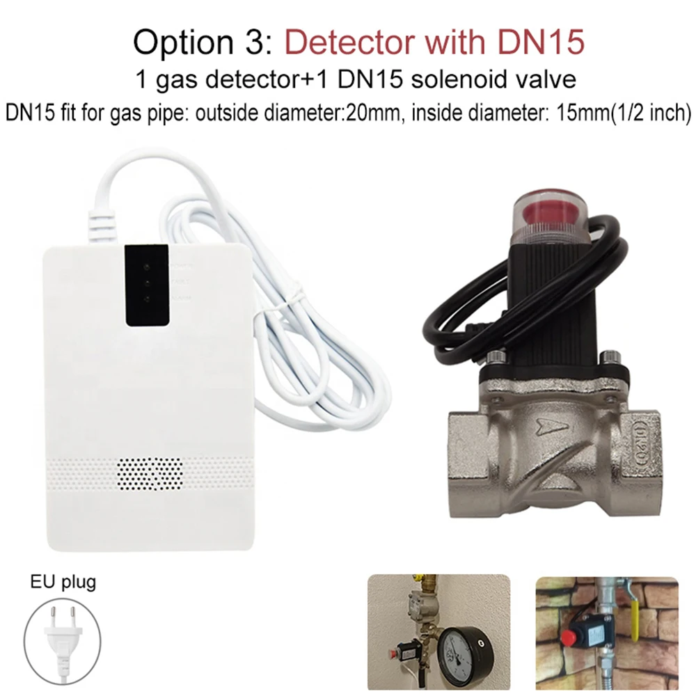 3. Детектор с DN15: Включает 1 Детектор Газа + 1 DN15 Электрический Соленоидный клапан для отключения клапана газовой трубы (DN15 подходит для газовой трубы: Наружный диаметр: 20 мм, Внутренний диаметр: 15 мм (1/2 дюйма).