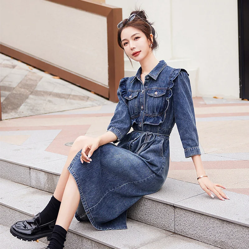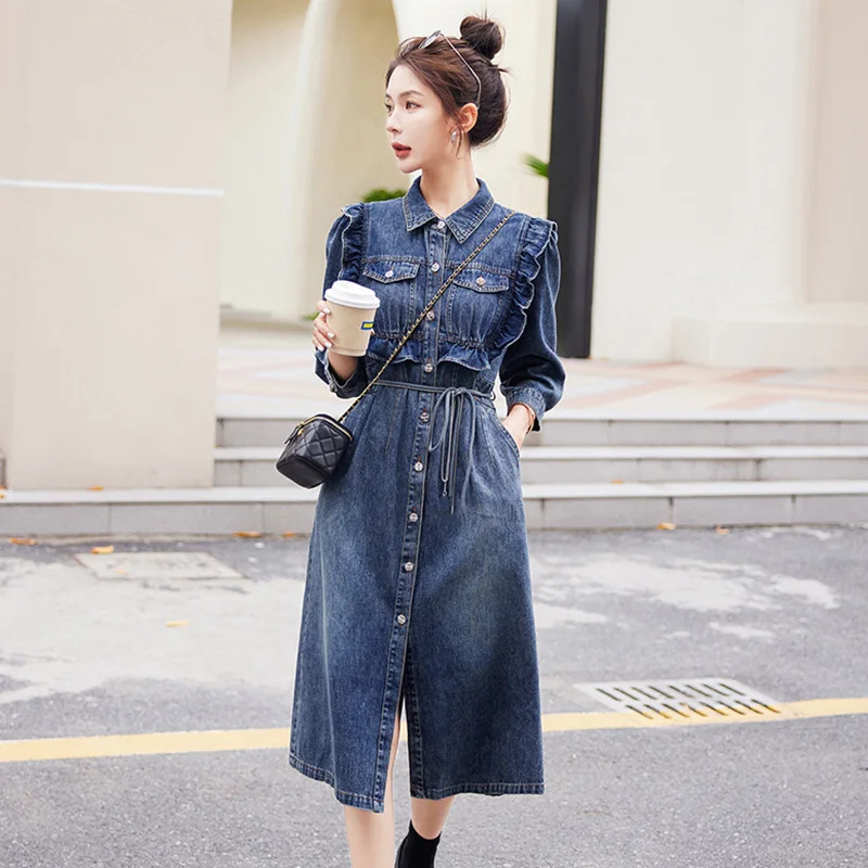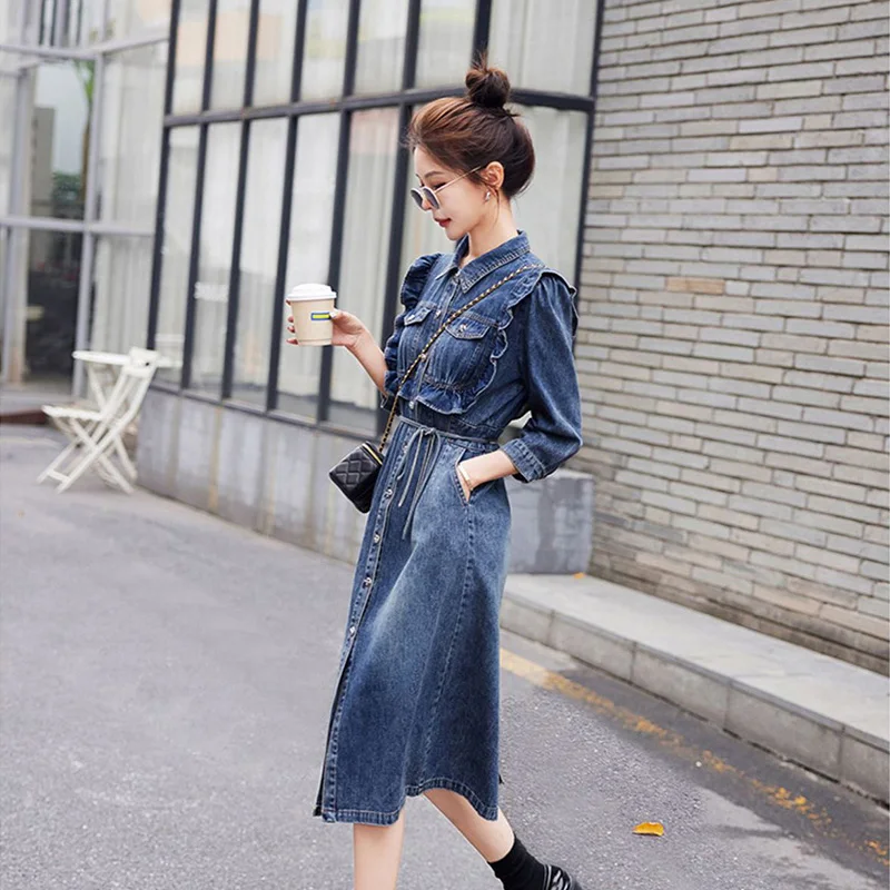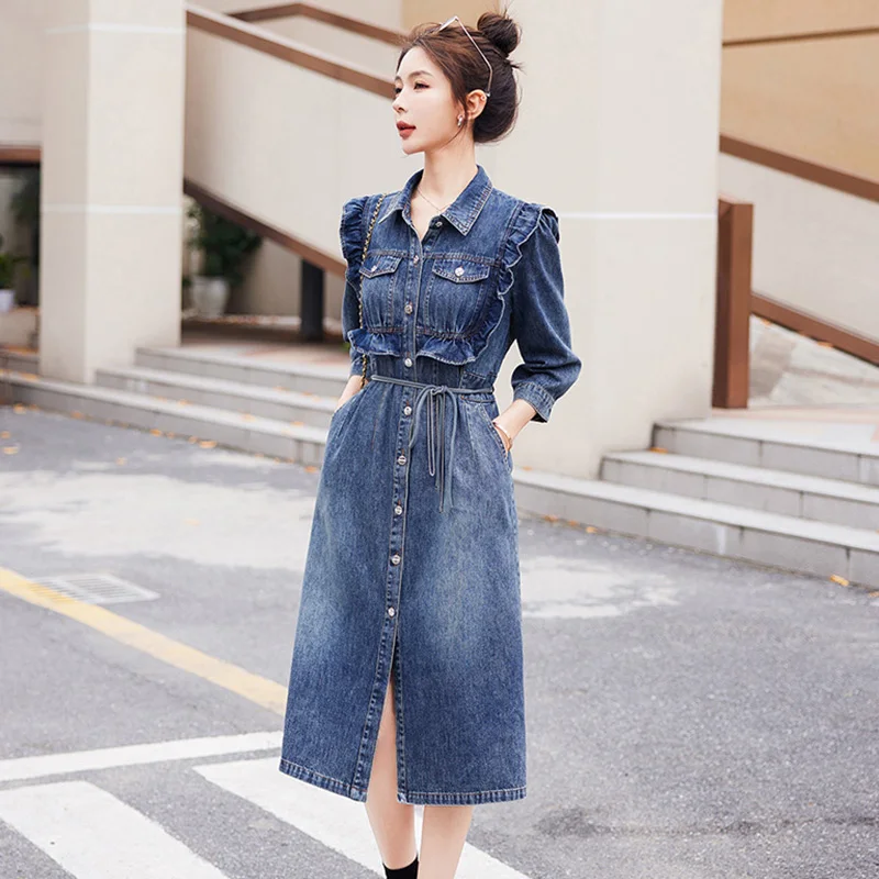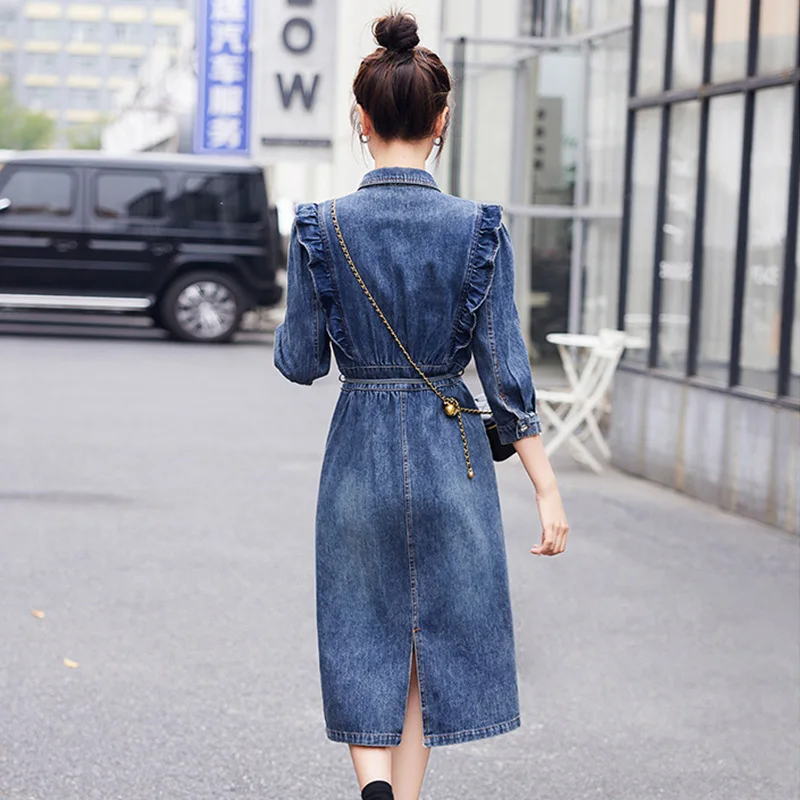 Отзывы о Элегантное женское джинсовое платье с оборками однобортное разрезом новинка