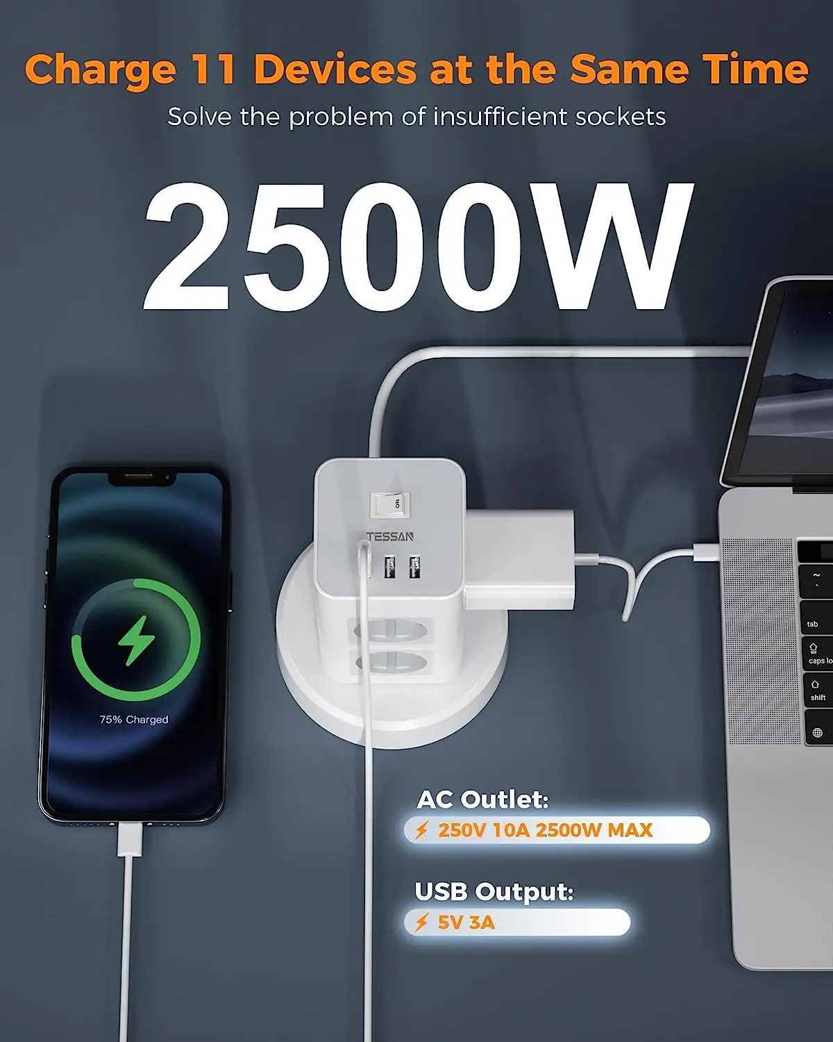 Вертикальный удлинитель TESSAN с USB выдвижной 2 м розетка EU KR - купить