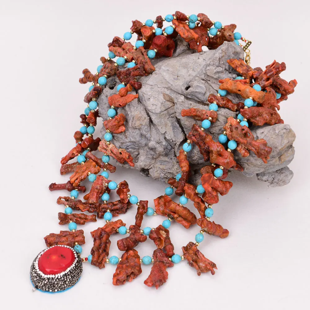 G-G 3 ряда синяя бирюза настоящая красная ветка кораллов необработанное Ожерелье - купить