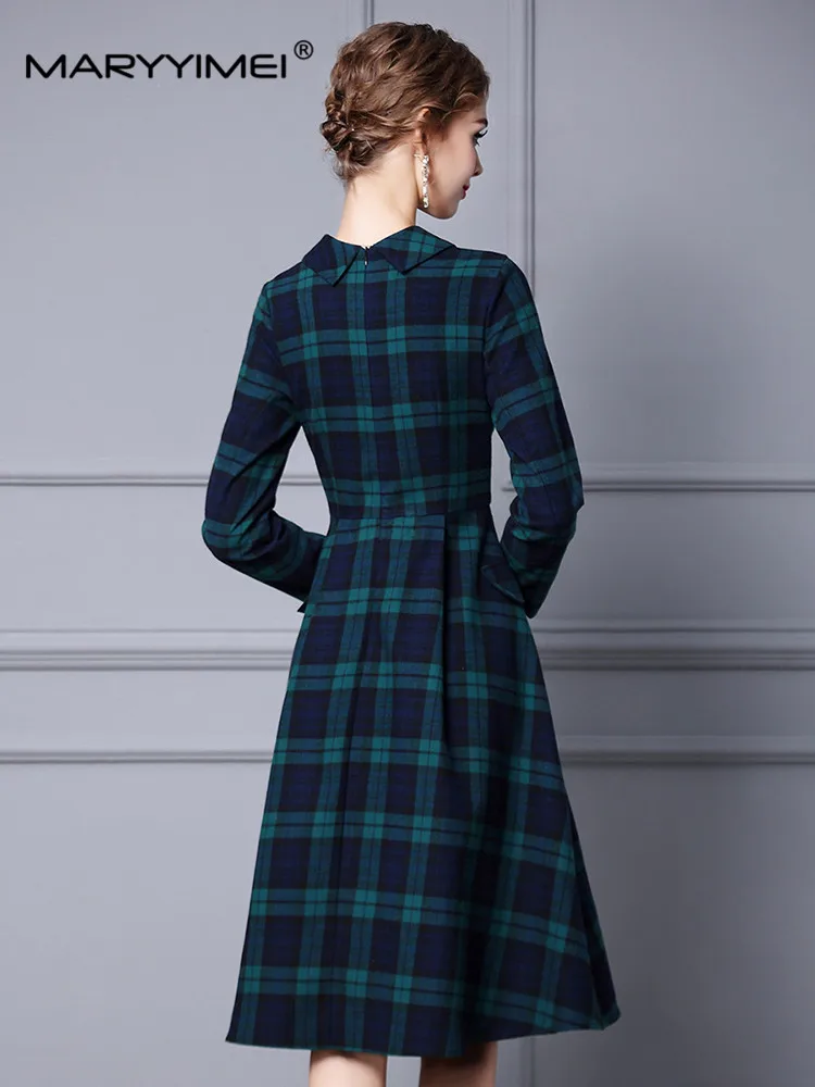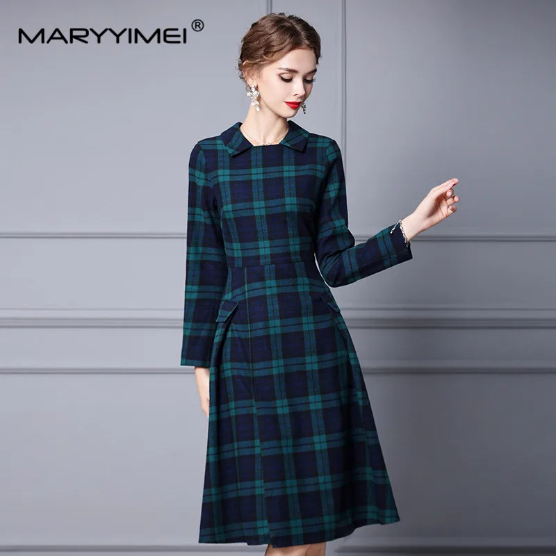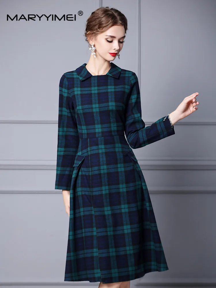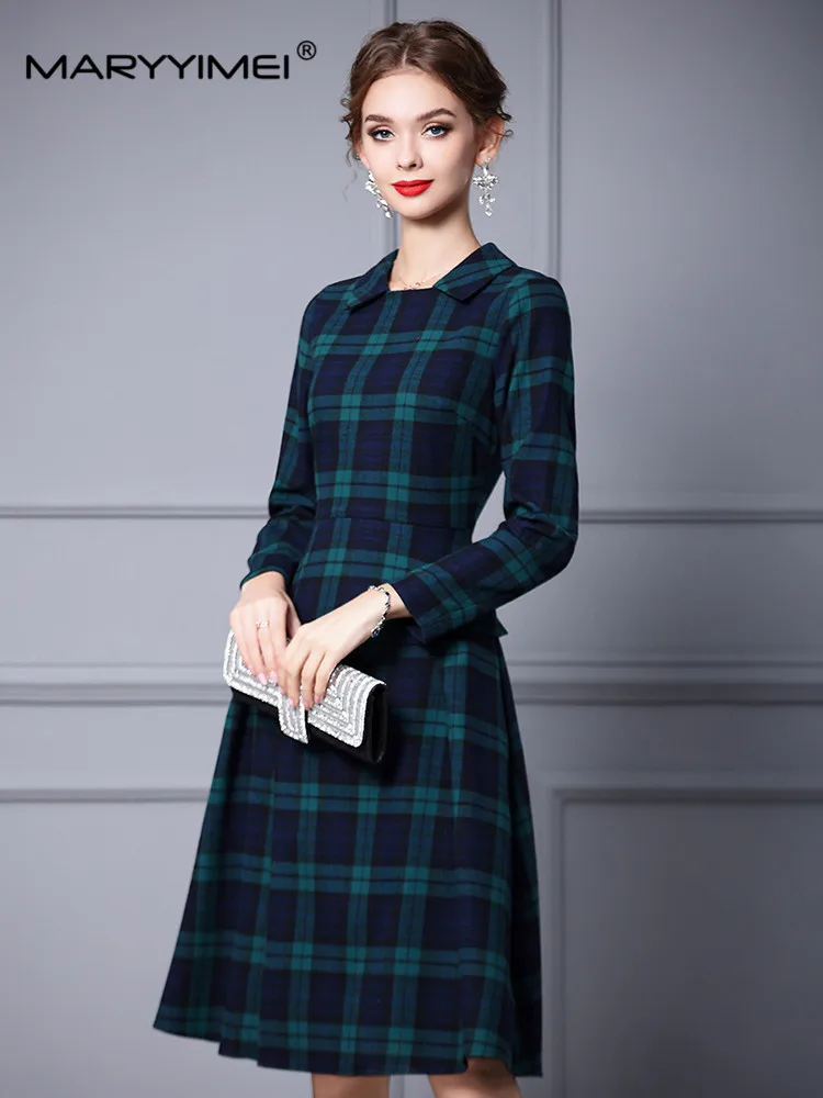 Женское платье-трапеция с отложным воротником и длинным рукавом в клетку - купить