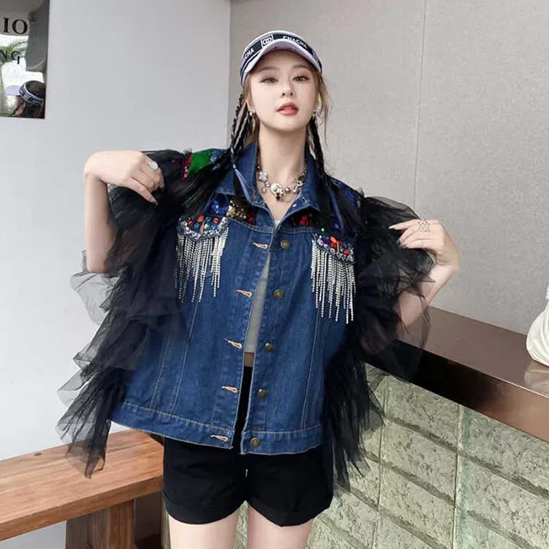Сетчатый лоскутный синий короткий джинсовый жилет с бриллиантами и кисточками - купить
