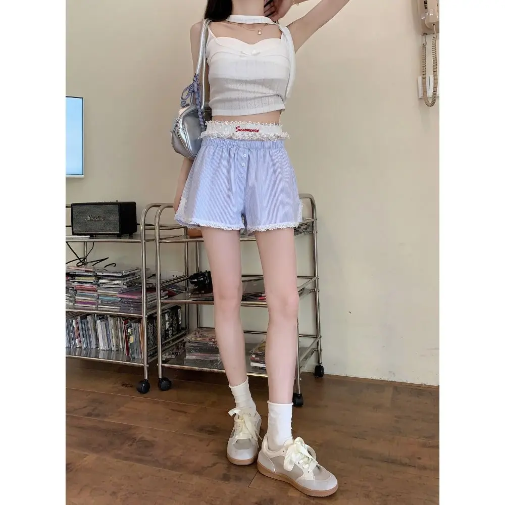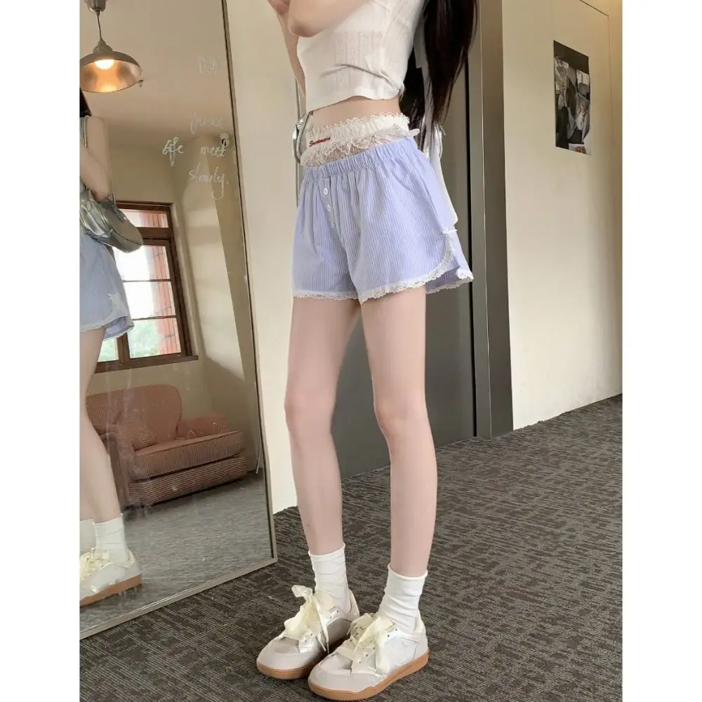 Симпатичные летние полосатые шорты на пуговицах синие розовые кружевные с - купить