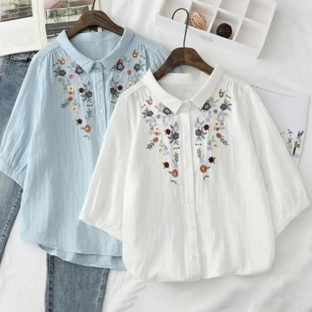 Отзывы о Женская однобортная офисная рубашка с цветочной вышивкой отложным воротником и