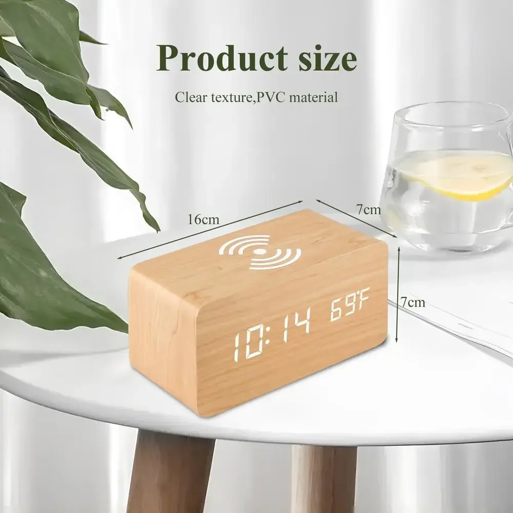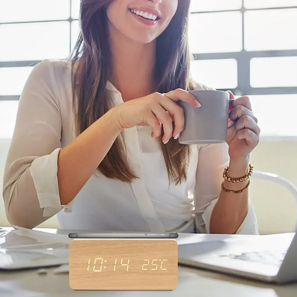 Настольные Цифровые часы деревянные с будильником Беспроводная зарядка - купить