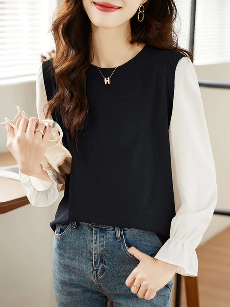 Элегантная простая рубашка контрастного цвета в стиле пэчворк с длинными - купить