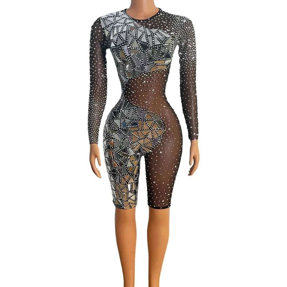 Отзывы о Блестящие зеркала серебряные стразы черное сетчатое боди женский наряд для