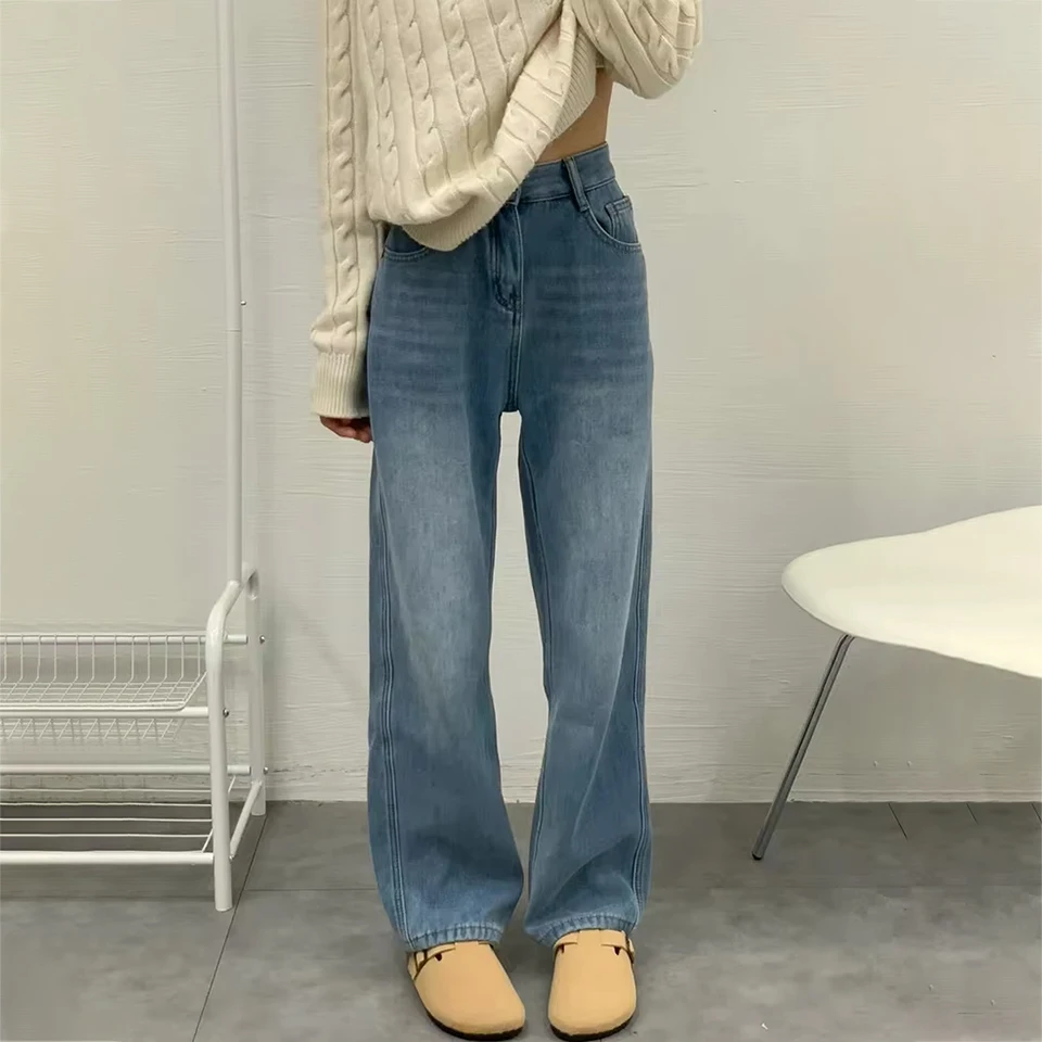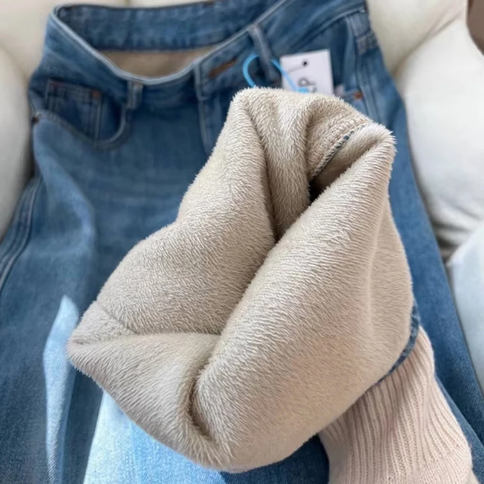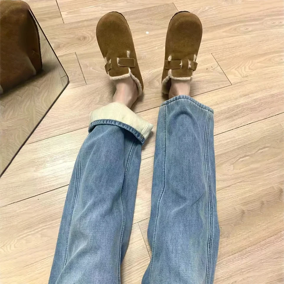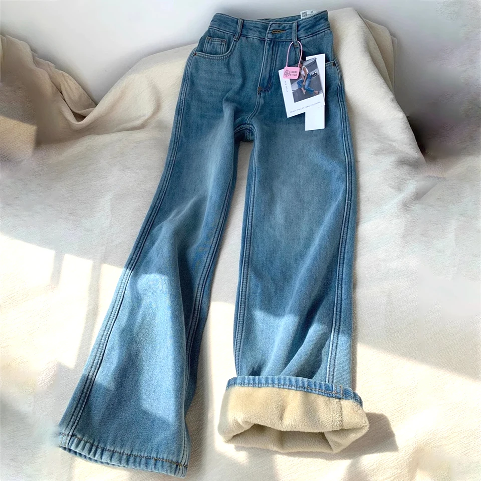 Зимние брюки с высокой талией на флисовой подкладке широкие джинсы теплые для - купить