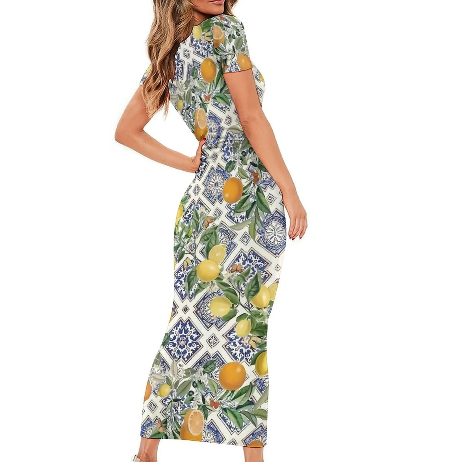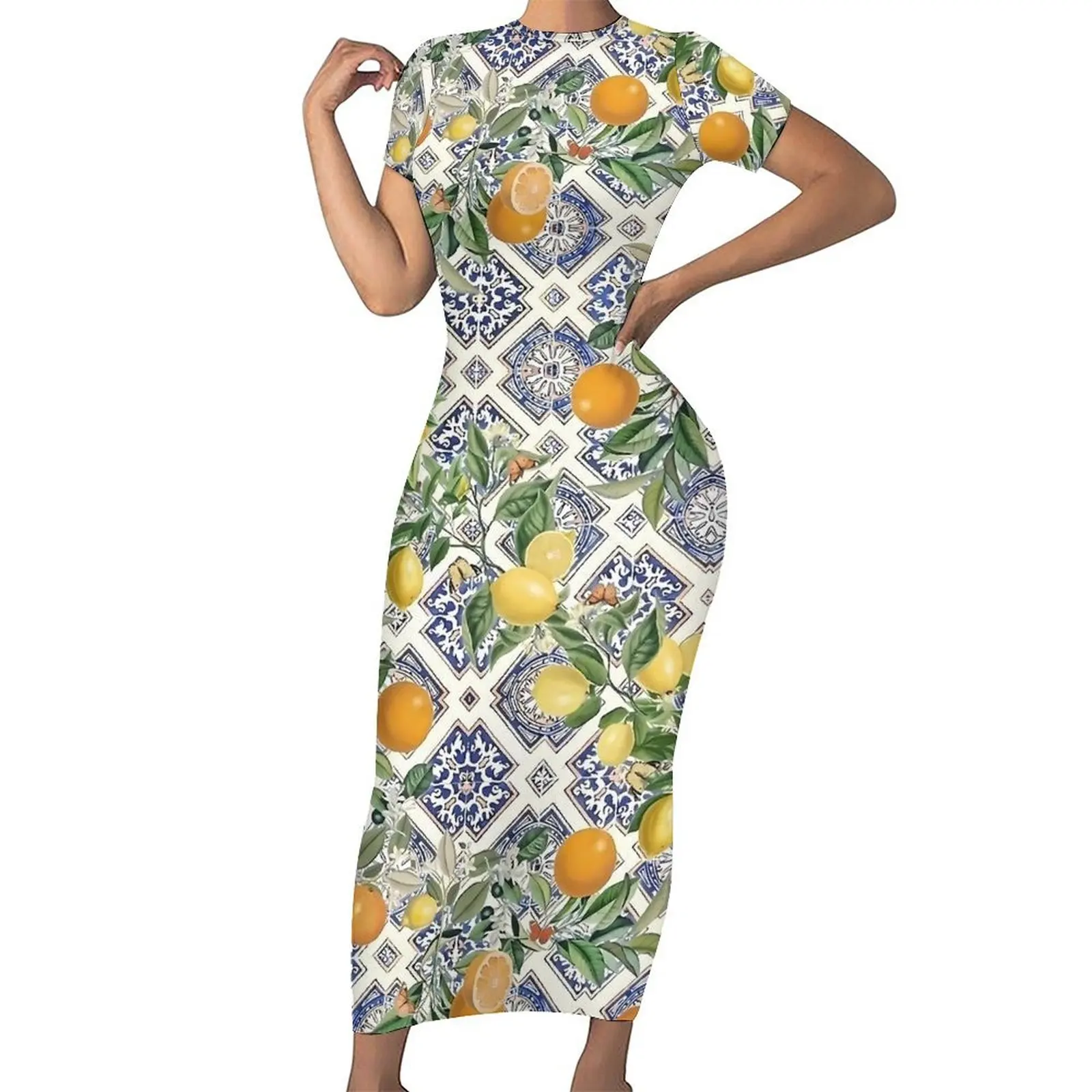 Отзывы о Лимонное платье с короткими рукавами плитка и цитрусовые фрукты макси-платья для