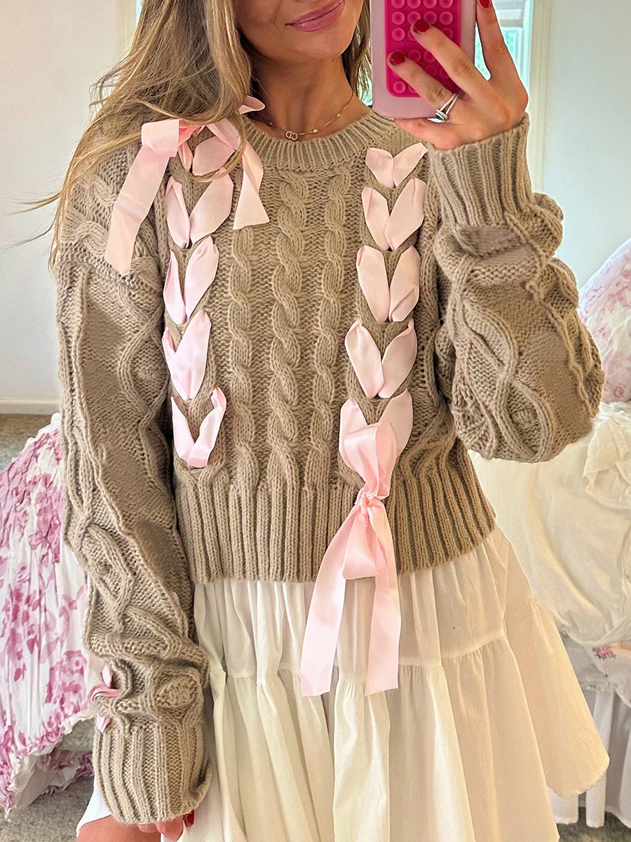 Chic Ribbon Criss-Cross Tie Up Sweater Girly Coquette Cable Knitted Pullovers Women Autumn Vintage Y2k Knitwear Jumpers Tops - купить