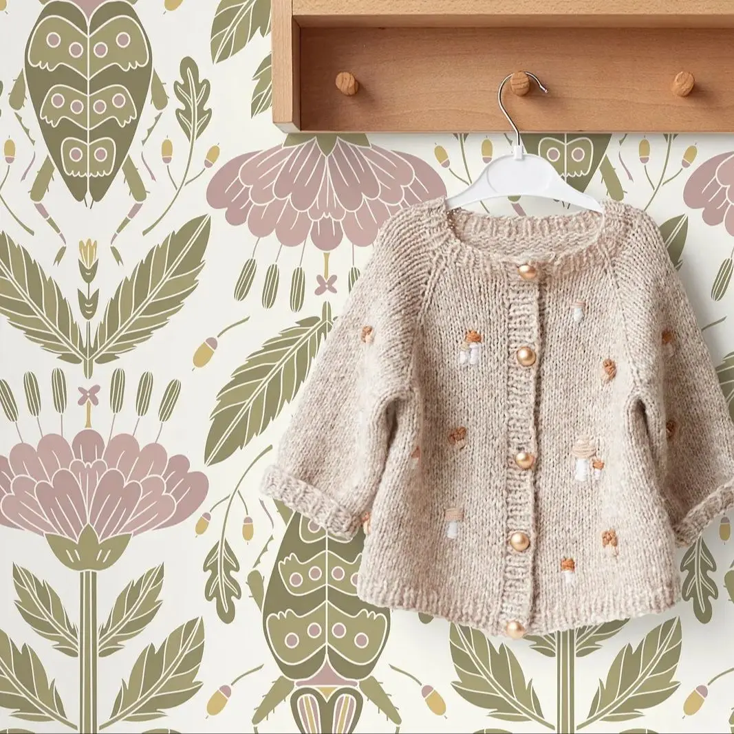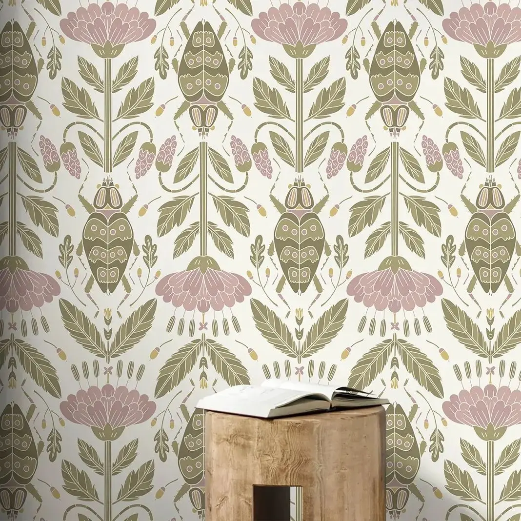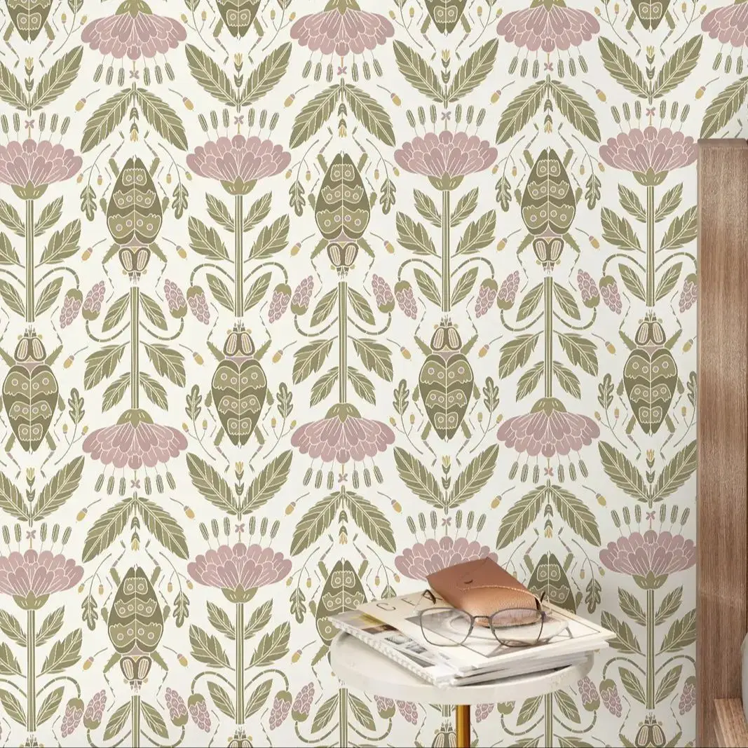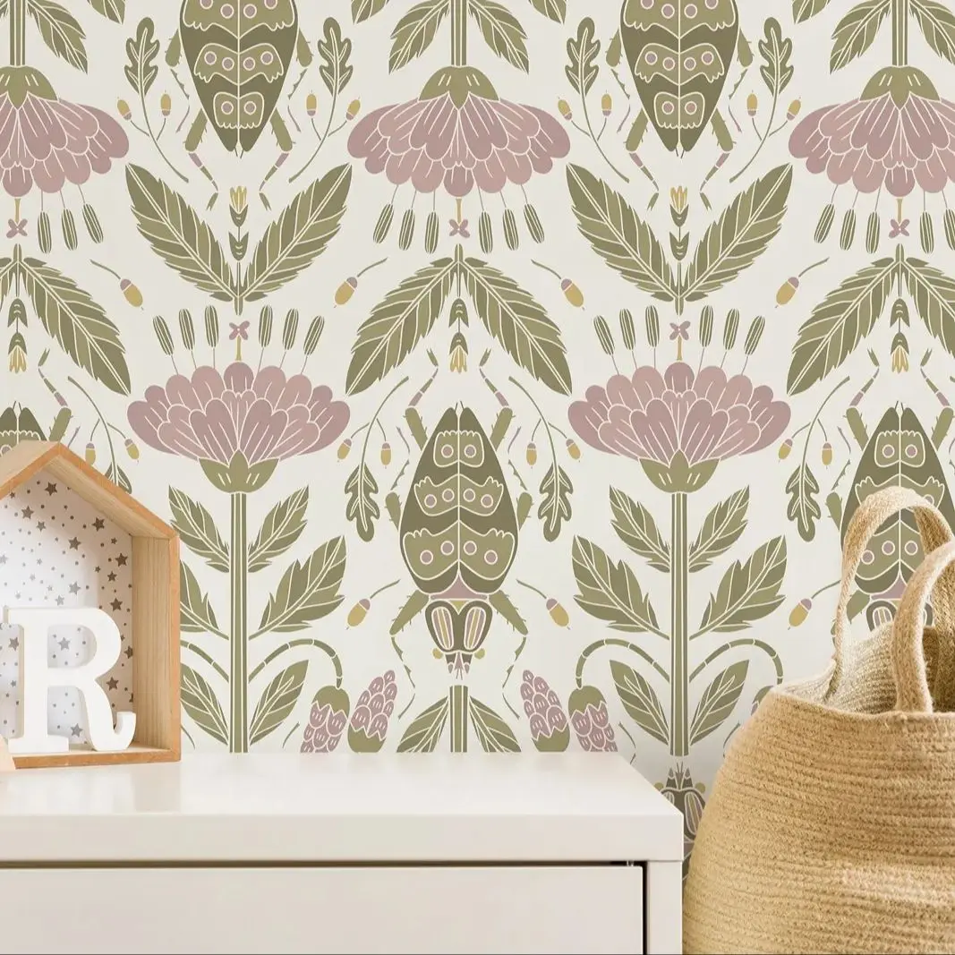Розовые обои с цветочным принтом и жуком отклеиванием наклейкой съемные - купить