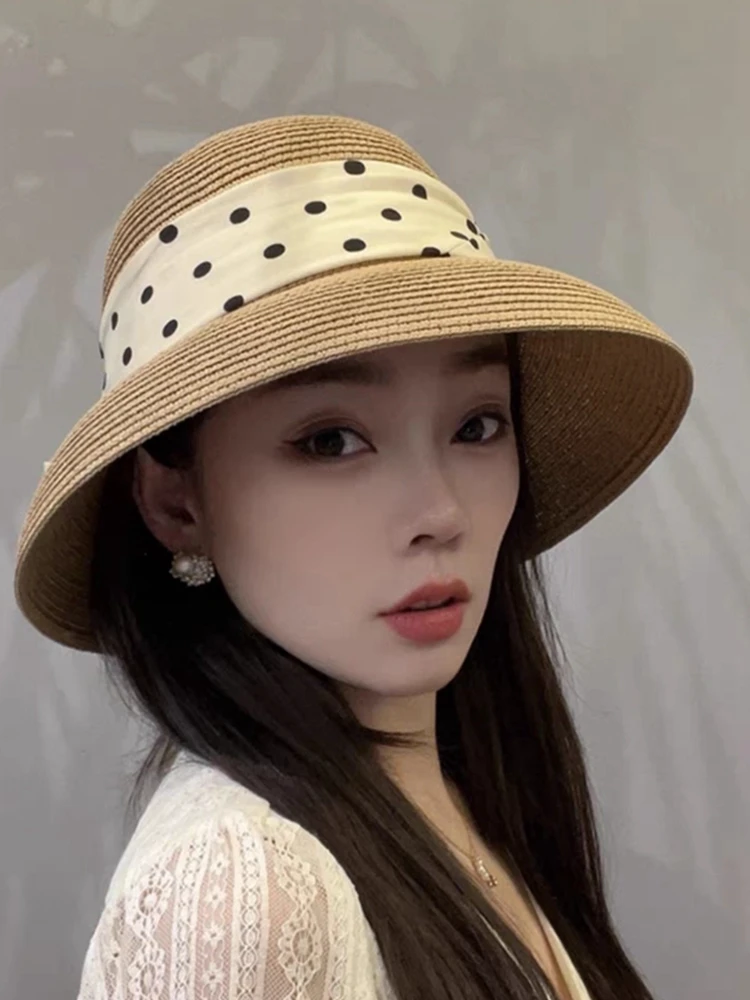 Отзывы о British Retro Hepburn Sle Polka Dot Fisherman Hat Summer Straw Breathable Sun Female Bow Outdoor Protection