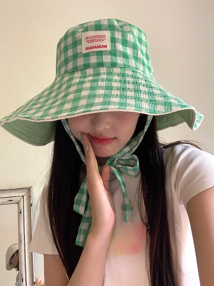 Корейская двусторонняя рыбацкая шляпа в клетку с широкими полями и шнуровкой - купить