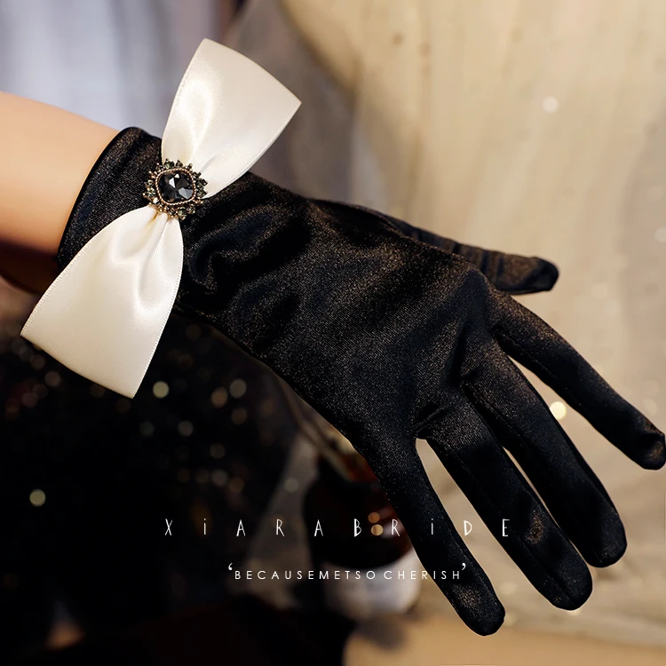 Отзывы о Женские элегантные черные атласные перчатки с бриллиантами и бантом женские