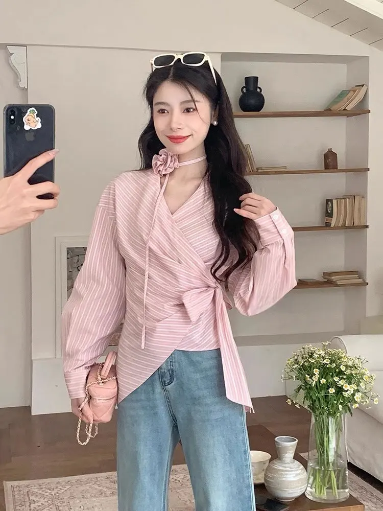 Женские розовые темпераментные модные рубашки в полоску с цветочным ремешком и - купить