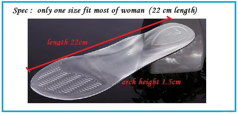 Тип изделия: длина 3/4 дизайн высокий каблук супинатор стелька Материал: силикон Функция: супинатор плоскостопия для снятия боли от давления Размер: это один размер подходит всем с длиной 22 см (длина 3/4 подходит для большинства женщин)