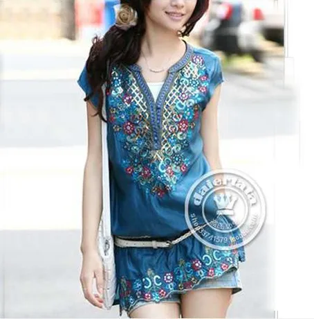 Бесплатная доставка, большие размеры, Женская мода 2015, короткий рукав, круглый вырез, вышитый шифон, бохо, хиппи, крестьянская, мексиканская блузкаUS $11,65 /Шт.