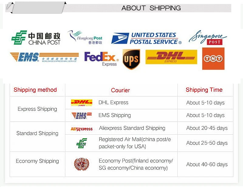 Мы обещаем: 1: производство только лучших потребительских товаров и обеспечение максимально высокого качества. 2: быстрая и точная доставка товаров нашим клиентам по всему миру Политика обслуживания клиентов Мы с радостью ответим на любые ваши вопросы, пожалуйста, свяжитесь с 1: Заказы обрабатываются своевременно после подтверждения оплаты. 2: Мы отправляем только по подтвержденным адресам заказа. Ваш адрес заказа должен совпадать с вашим адресом доставки. 3: Если вы не получили посылку в течение 30 дней с момента оплаты, пожалуйста, свяжитесь с нами. Мы отследим отправку и свяжемся с вами как можно скорее. Наша цель – удовлетворение клиентов! 4: из-за наличия на складе и разницы во времени, мы выберем доставку Вашего товара с нашего первого доступного склада для быстрой доставки. Наши преимущества 1: Мы все имеем собственный запас, с адекватной поставкой 2: качество продукта достигло серии сертификации 3: Мы поддерживаем различные перевозки, Гонконг и китайские почтовые пакеты, EMS.DHL federal. UPS и TNT, может полностью удовлетворить различные потребности покупателя. Я твердо уверен Мы будем вашим лучшим партнером