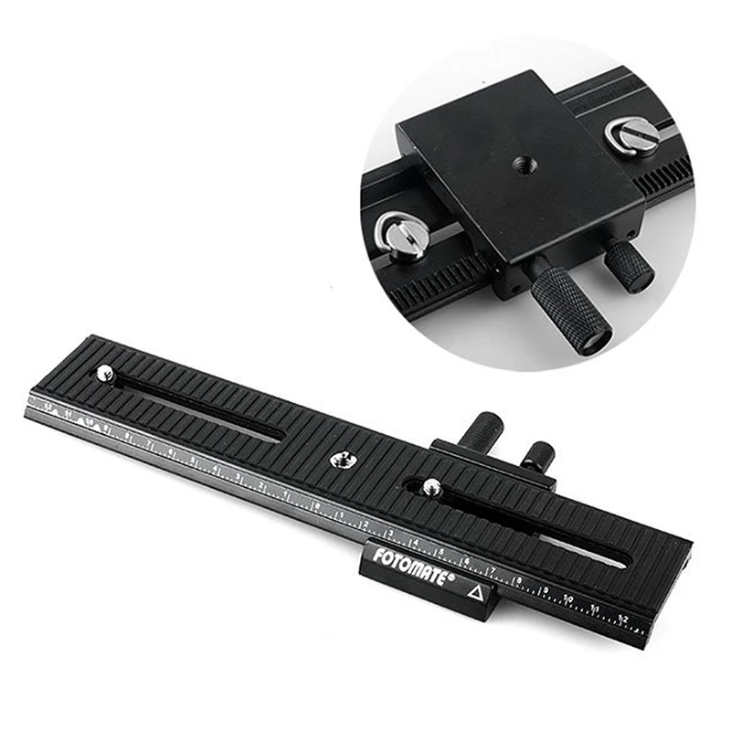 Система привода с редуктором может значительно повысить точность и скорость регулировки слайдера, а размер винта-международный стандарт: 1/4 ", подходит для большинства штативов и копировальных стендов.