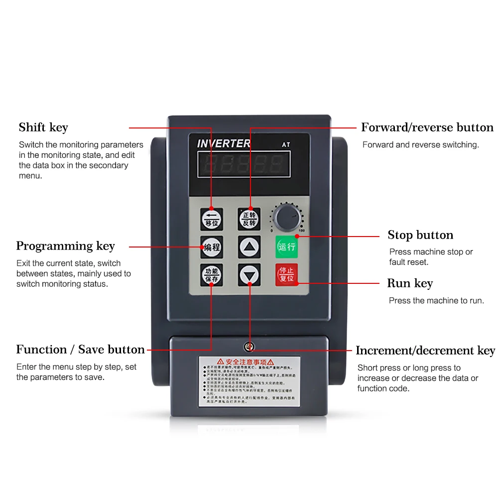 Метод управления: V/F контроль Мощность: 0.75 кВт/1.5 кВт/2.2 кВт/4 кВт/5.5 кВт/7,5 кВт Вес: 0,75-2.2kw: около 1,5 кг 4-5.5kw: около 3 кг 7.5kw: около 4 кг 1. Входная и выходная мощность: Входное напряжение: 220 В +-15% Выходное напряжение: 0 ~ 380 В Входная частота: 50 Гц/60 Гц Выходная частота: 0 ~ 400 Гц (высокая частота 0 ~ 2000 Гц) 2. Входной и выходной интерфейс: Аналоговый вход: 0-5 В, 0-10 В, 0-20 мА, 4-20 мА 6-ти канальный цифровой вход (внутренняя Выдвижная до 12V) может достигать 8-скорость, клавиши управления, дистанционный пульт старт, Кнопка аварийной остановки, передним и задним ходом, для пробежек, и т. д. Релейный выход 1 способ (индикация работы, индикация неисправности, индикация прибытия частоты) Открытый коллекционный выход 1 3. Технические характеристики: Возможность перегрузки: 150%, номинальный ток 60s, 200% 3s Частота несущей передачи: 3-10 кГц (высокая несущая модель 3-20 кГц)|