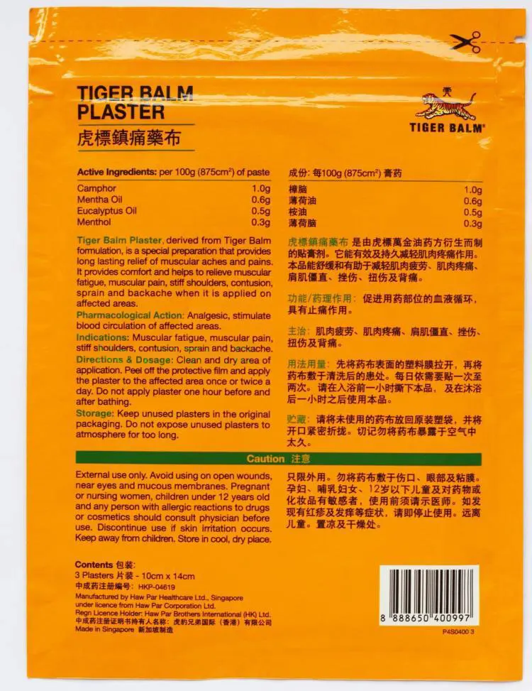 Примечание: Поскольку производители заменяют упаковку продукта, 9 штук товара без упаковки, 1 упаковка = 3 штуки, 3 упаковки = 9 штук! Прошу прощения! Это настоящий пластырь Tiger Balm, изготовленный и упакованный Haw Par Healthcare в Сингапуре Для длительного облегчения боли и воспаления Пластырь Tiger Balm-RD-это обезболивающий и мягкий противовоспалительный препарат. После применения его ингредиенты впитываются в кожу для стимуляции кровообращения, что помогает ускорить процесс заживления. Его быстрое пронизывающее действие обеспечивает быстрое облегчение и комфорт в течение нескольких часов. Активные ингредиенты: камфор, ментол, мента масло, эвкалиптовое масло и экстракт капсикула Показания: мышечная усталость, мышечная боль, твердые плечи, ушиб, растяжение, боль в спине и артритные боли. Направления: чистая и сухая область применения. Снимите защитную пленку и нанесите штукатурку на пораженный участок один или два раза в день. Нанесите штукатурку через полчаса после купания, удалите штукатурку за час до купания. Внимание: только для наружного использования. Не наносите вокруг глаз, слизистой оболочки, ран или воспаленной кожи. Прекратите использование при возникновении раздражения кожи. Беременным женщинам, кормящим матерям и любому человеку с аллергическими реакциями (такими как сыпь, покраснение, зуд и извержения) к лекарственным средствам или косметическим средствам следует проконсультироваться с врачом перед использованием. Дети должны использовать этот продукт под наблюдением. Хранение: Держите штукатурку в недоступном для детей месте. Боль в прохладном месте вдали от прямых солнечных лучей. Храните неиспользованные штукатурки в оригинальной упаковке. Не подвергайте неиспользованные штукатурки воздействию атмосферы слишком долго.
