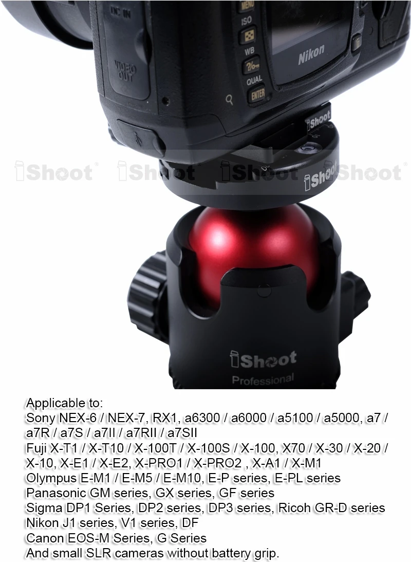 | Sony NEX-6 / NEX-7, RX1, a6300 / a6000 / a5100 / a5000, a7 / a7R / a7S / a7II / a7RII / a7SII Fuji X-T1 / X-T10 / X-100T / X-100S / X-100, X70 / X-30 / X-20 / X-10, X-E1 / X-E2, X-PRO1 / X-PRO2, X-A1 / X-M1 Olympus E-M1 / E-M5 / E-M10, серия E-P, серия E-PL Серия Panasonic GM, серия GX, серия GF Серия Sigma DP1, серия DP2, серия DP3, серия Ricoh GR-D Серия Nikon J1, серия V1, DF Серия Canon EOS-M, серия G И небольшие SLR камеры без рукоятки аккумулятора. |