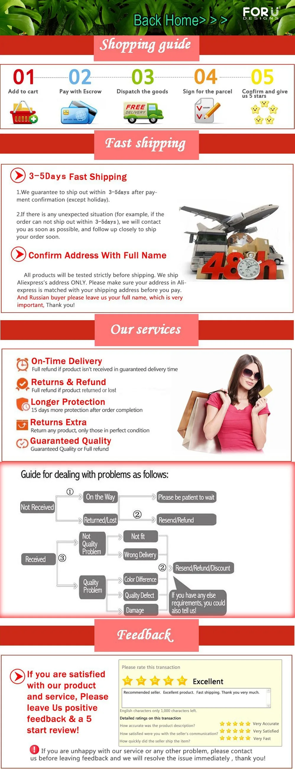 Your satisfaction and positive feedback is very important to us. Please leave positive feedback and 5 stars if you are satisfied with our items and services. If you have any problems with our items or services, Please feel free to contact us first before you leave negative feedback. We will do our best to solve any problems and provide you with the best customer services.
