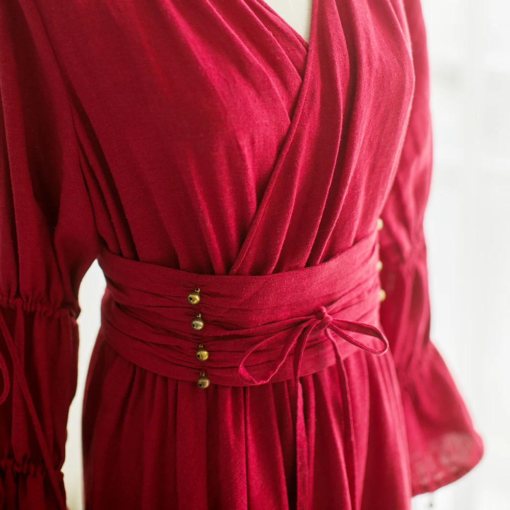 MM156 Новое поступление весна лето 2017 женское этническое маленькое колокольчик с поясом Длинный рукав макси хлопок и лен винтажное платье красное