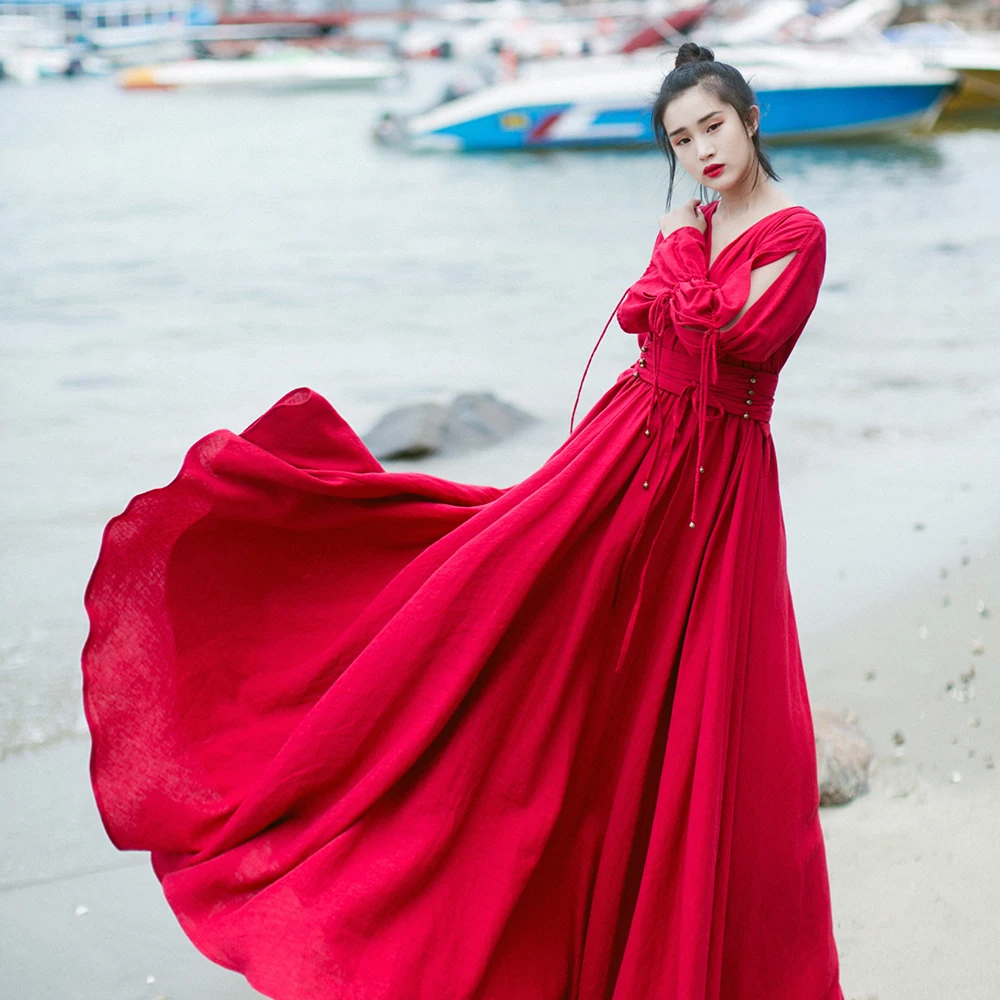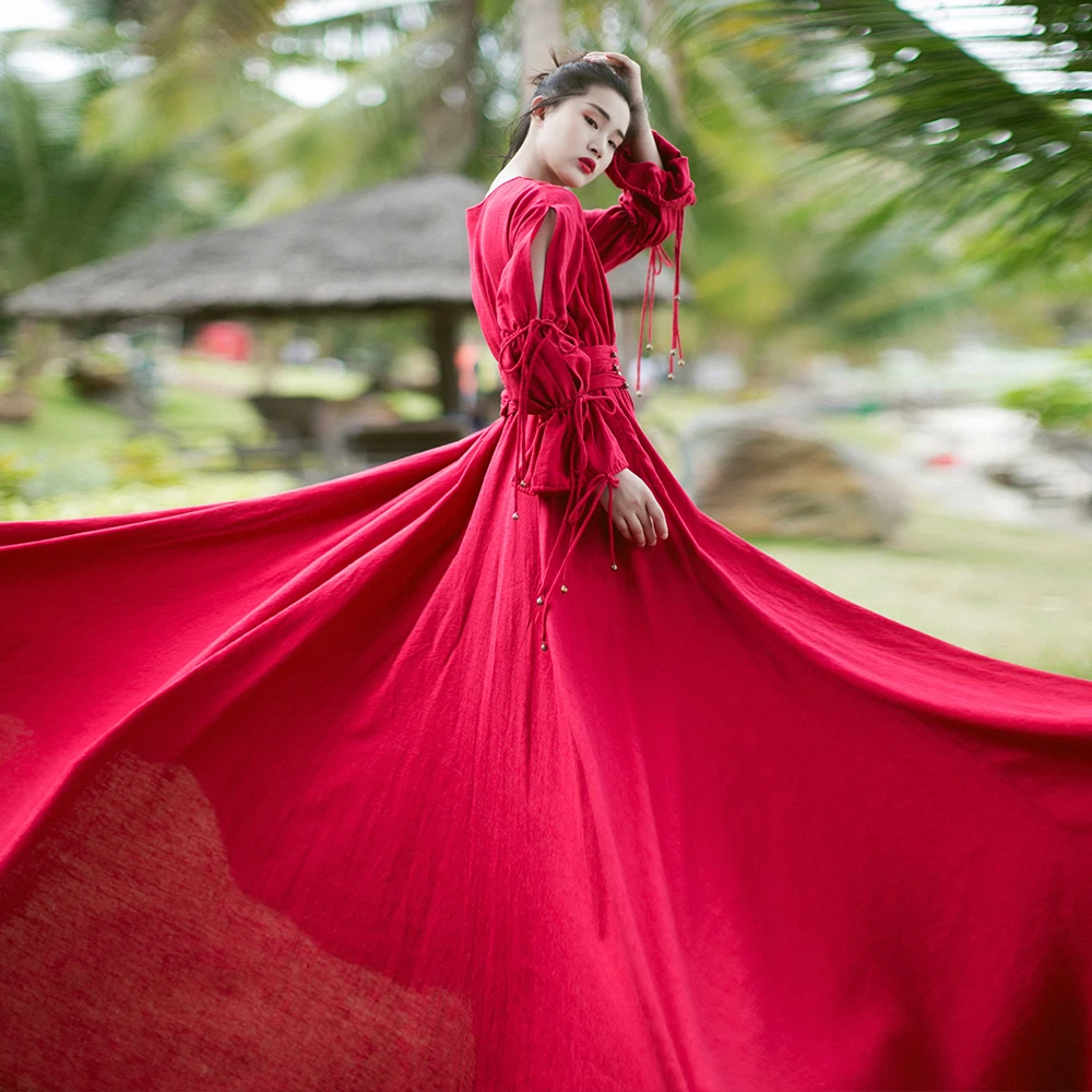 Отзывы о Женское винтажное платье MM156 красное Макси-платье из хлопка и льна с длинным