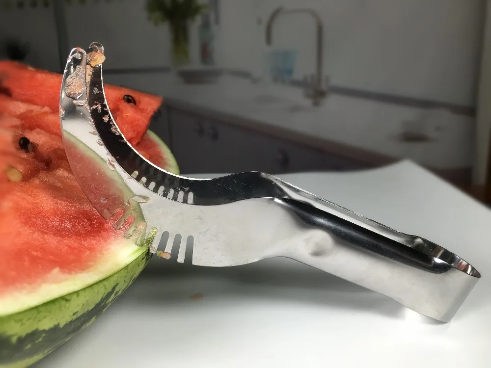 Все любят арбуз-но никто не любит процесс резки! Плотная и твердая кожура арбуза затрудняет нарезание этого вкусного фрукта. Многие люди хотят избежать этой задачи и просто едят этот вкусный фрукт. Ну, теперь ваше желание сбылось с нашим специальным карвером 3 в 1, нож для арбуза, и серверами посуды! С помощью этого инструмента вы можете быстро и эффективно вырезать арбуз и иметь его готов!