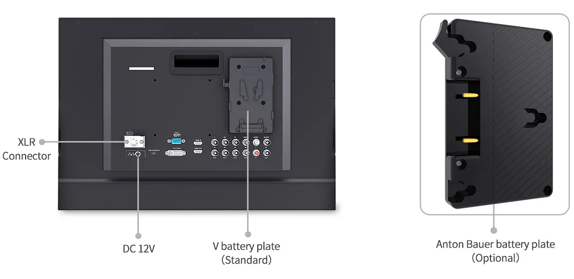 Беспроблемная мощность Мониторинг в любом месте, где вам это нужно!Мы сделали его легким для включения монитора. 4K215-9HSD-192-CO может питаться двумя способами: с адаптером постоянного тока или литиевыми батареями. 4K215-9HSD-192-CO имеет гибкую систему батарей, которая поддерживает V battery plate (стандарт), Anton Bauer battery plate по вашему выбору.