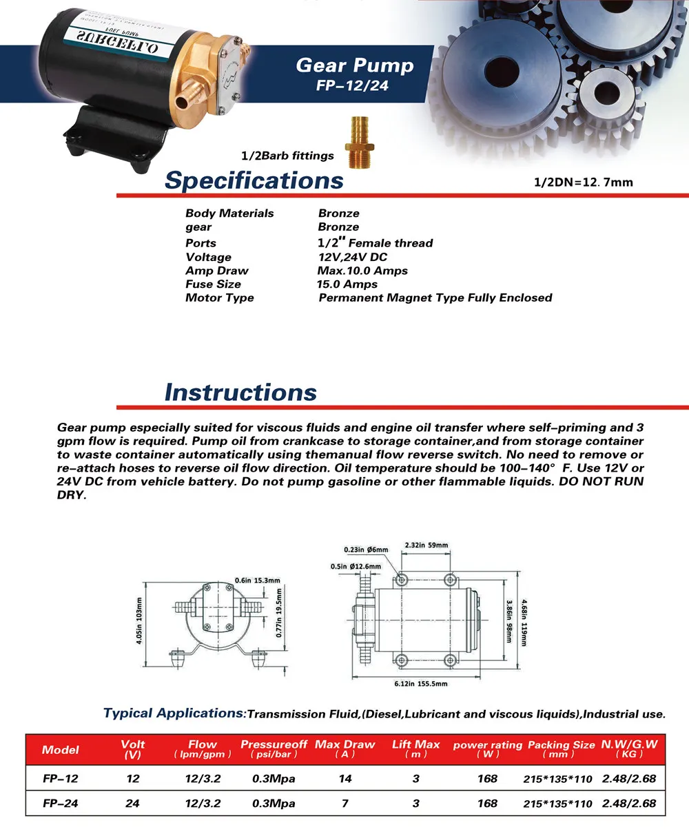 Шестеренчатый насос особенно подходит для вязких жидкостей и перекачки моторного масла, где требуется самовсасывание и расход 3 gpm. Перекачивать масло из Картера в контейнер для хранения, а из контейнера для хранения в контейнер для отходов автоматически с помощью автоматического потока Реверсивный переключатель. Нет необходимости снимать или повторно присоединять шланги для обратного направления потока масла. Температура масла должна быть 100-140 F. Используйте 12 В или 24 В постоянного тока от аккумулятора транспортного средства. Не перекачивайте бензин или другие легковоспламеняющиеся жидкости. Не высушивать