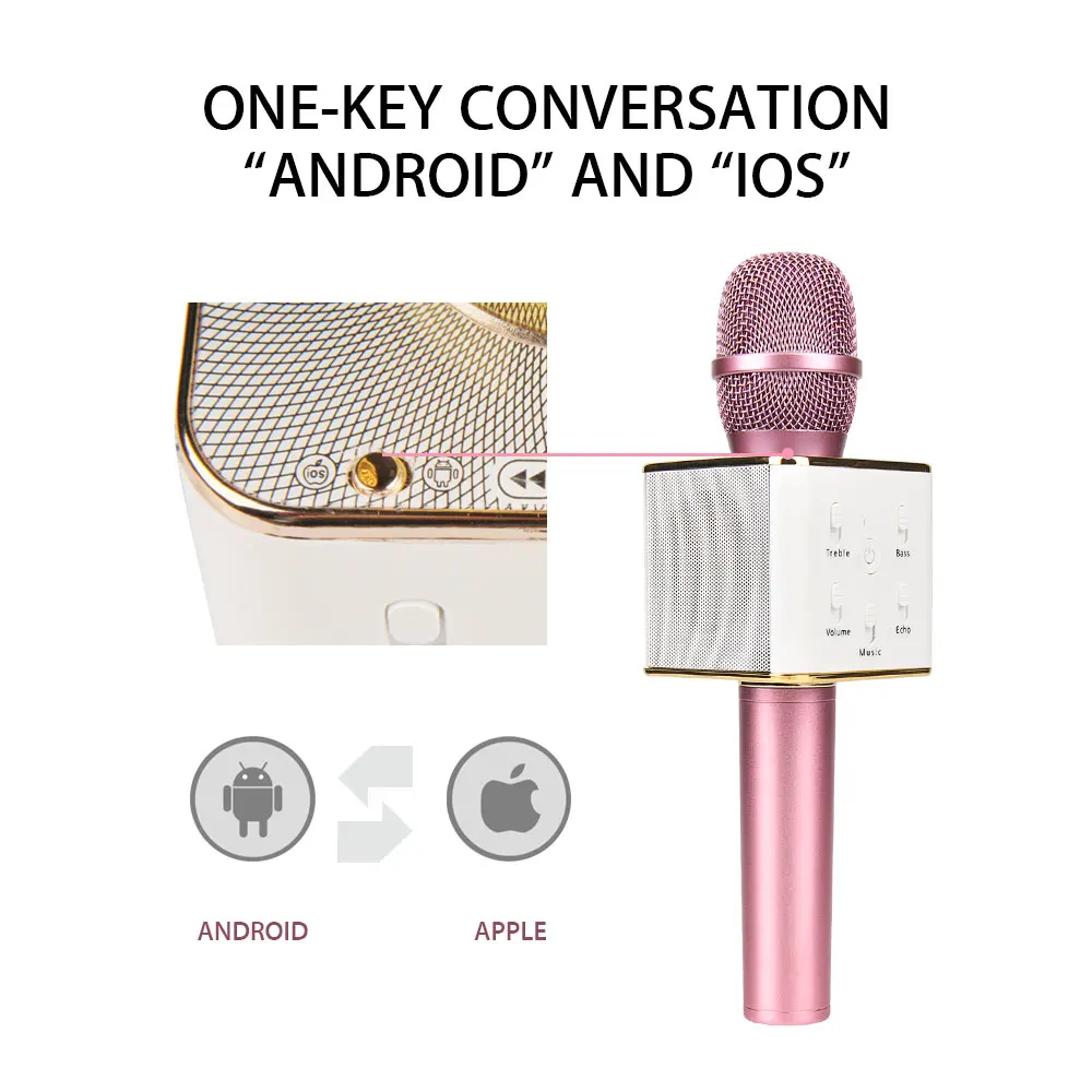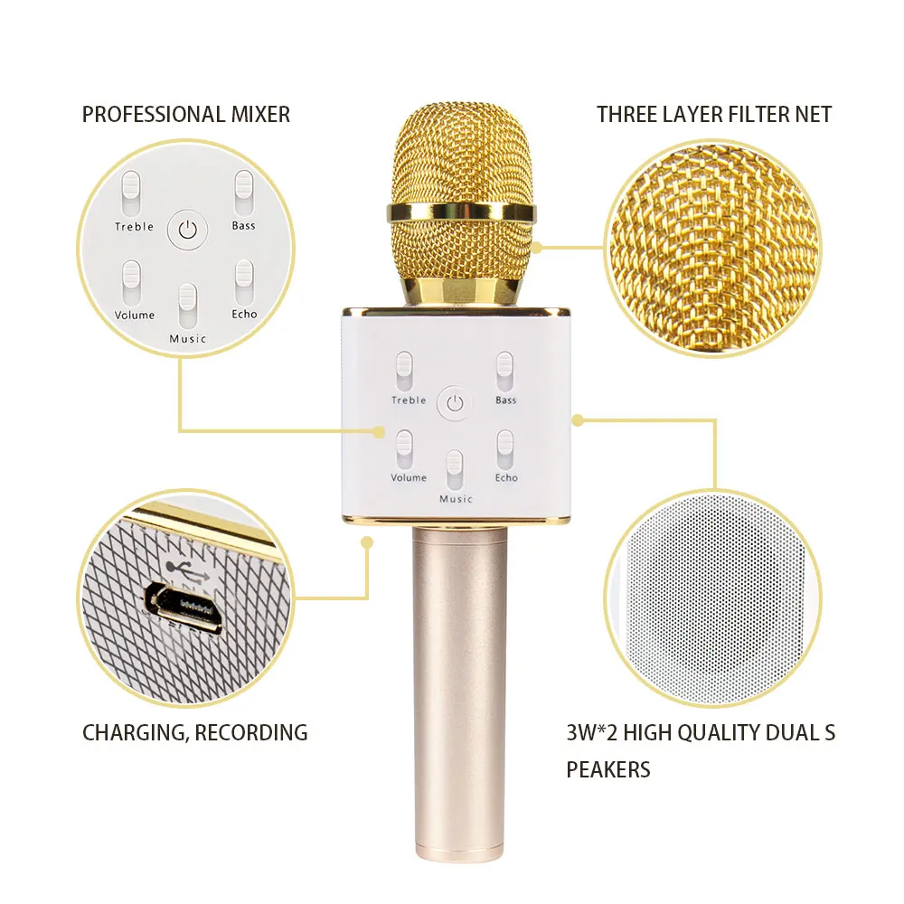 Описание ET Q7 Pro Микрофон Особенности: 1. [Беспроводной Связи и Кабель Соединения]вы можете соединиться с вашего телефона с кабелем или Bluetooth. и включите пение программное обеспечение на вашем телефоне или на вашем компьютере. с 3.5 мм аудио разъем, он совместим с Android, iOS телефон, и т. д. таким образом, вы можете услышать ваш голос будет поступать из динамика.2. [многослойная Подавление Шума и Эхо Эффект]снизить уровень шума и выделить оригинальный звук с 3 слоев, внутренняя высокой плотности губки, средний сети и внешней сети. эхо эффект так же, как КТВ, вы будете чувствовать себя нравится быть на сцене караоке. убедитесь, что вы можете наслаждаться аудио праздник.3. [Высокая Чувствительность Микрофона]нет необходимости стремиться микрофон, она может захватить ваш голос с пикап отверстие. высокая чувствительность микрофона превратит вашу комнату в КТВ в одно мгновение.4. [Простой Операции]нет необходимости покупать любой аксессуар, но вы можете наслаждаться караоке эффект. легко и удобно операция подходит для различных групп людей.5. [Записи и Время Выдержки]запись песни, как инструкции на караоке ОК. он поддерживает почти пение программного обеспечения независимо от того, по телефону или на компьютере. с2600 мАч батареи, он поддерживает до 3 часов игрового временивы можете зарядить свой телефонET Q7 Pro Микрофонспецификация:пикап: КонденсаторРежим реверберации: Эхо реверберациивыходная Мощность: 3 Вт * 2Bluetooth: 4.0Диапазон частот: 100 Гц-10 кГцмаксимальный УРОВЕНЬ ЗВУКОВОГО ДАВЛЕНИЯ: > 115dBвстроенный полимерный аккумулятор: 2600 мАчВремя игры: 3 часовв Режиме ожидания: 360 часовзарядное Напряжение: 5 Вглавный Пункт Размер: Прибл. 24.5*7*7 см/9.65*2.76 * 2.76inосновной Вес: Прибл. 394 г/13.91 унц.Размер упаковки: Прибл. 29*12.5*8 см/11.42*4.92 * 3.15inВес упаковки: Прибл. 668 г/23.59 унц.ET Q7 Pro МикрофонСписок пакета:1 * Микрофон1 * USB Кабель1*3.5 мм Аудио Кабель1 * Руководство ПользователяET Q7 Pro Микрофон Фото Показать: